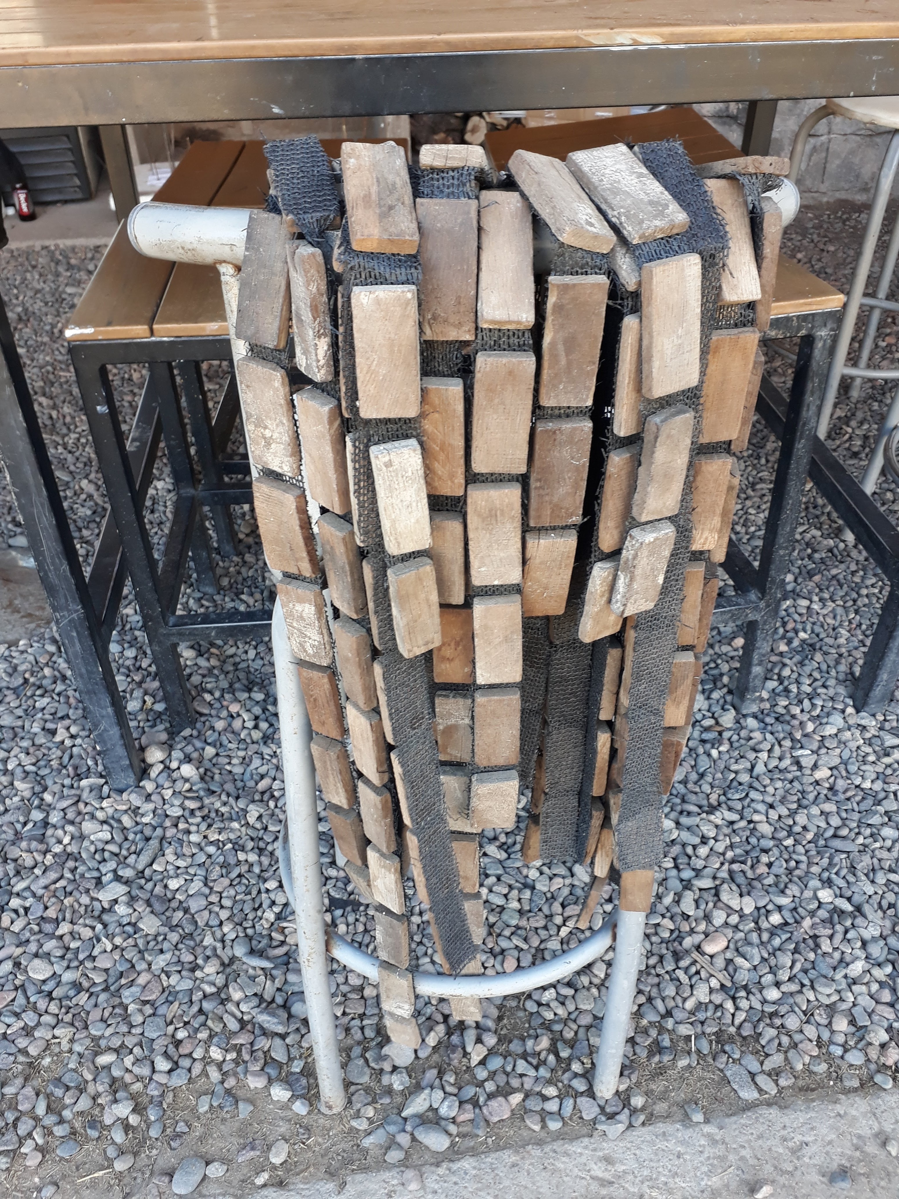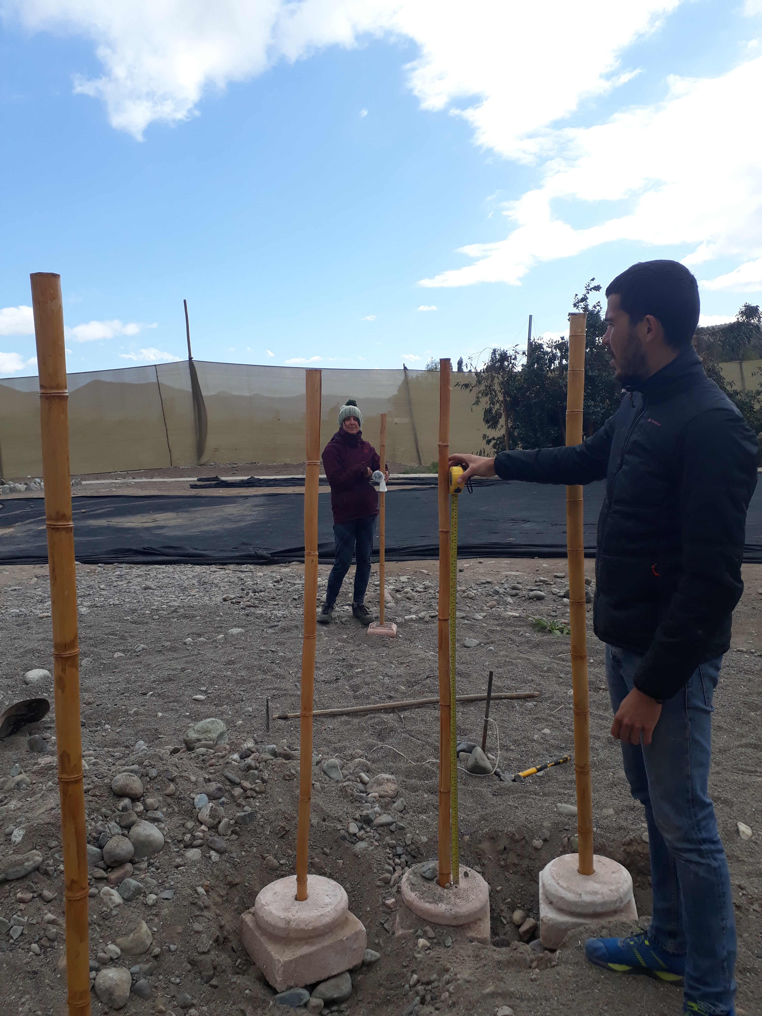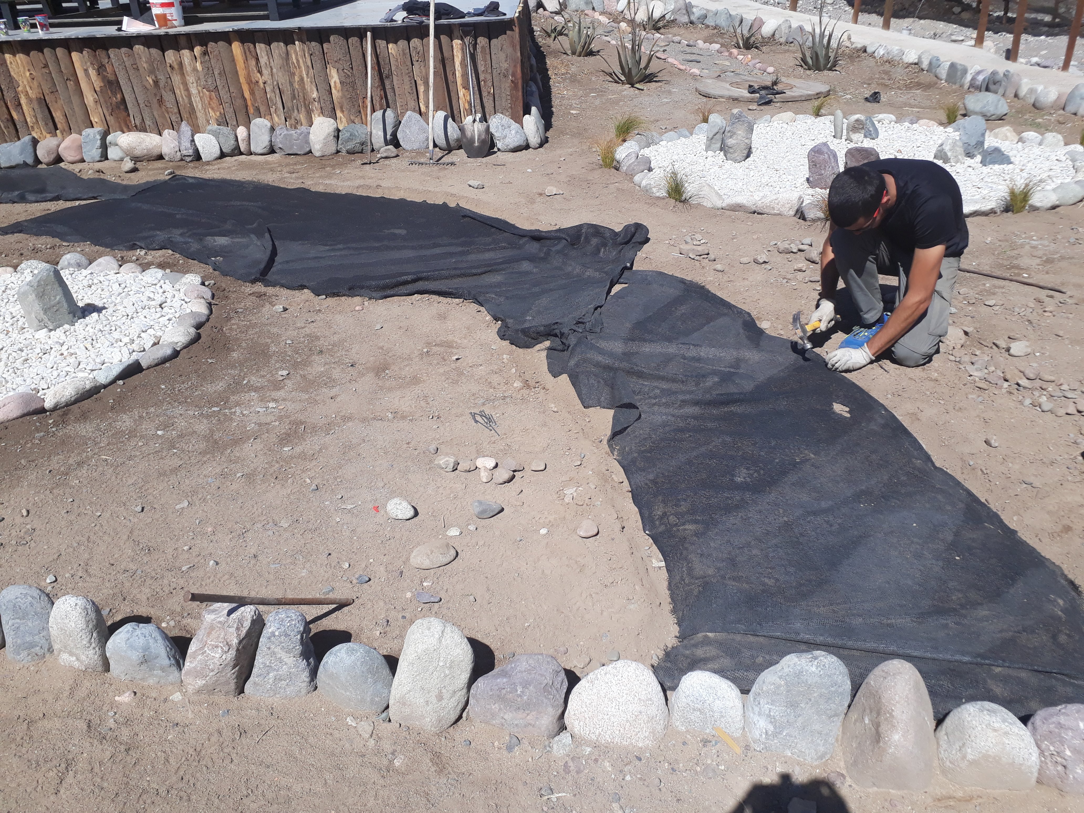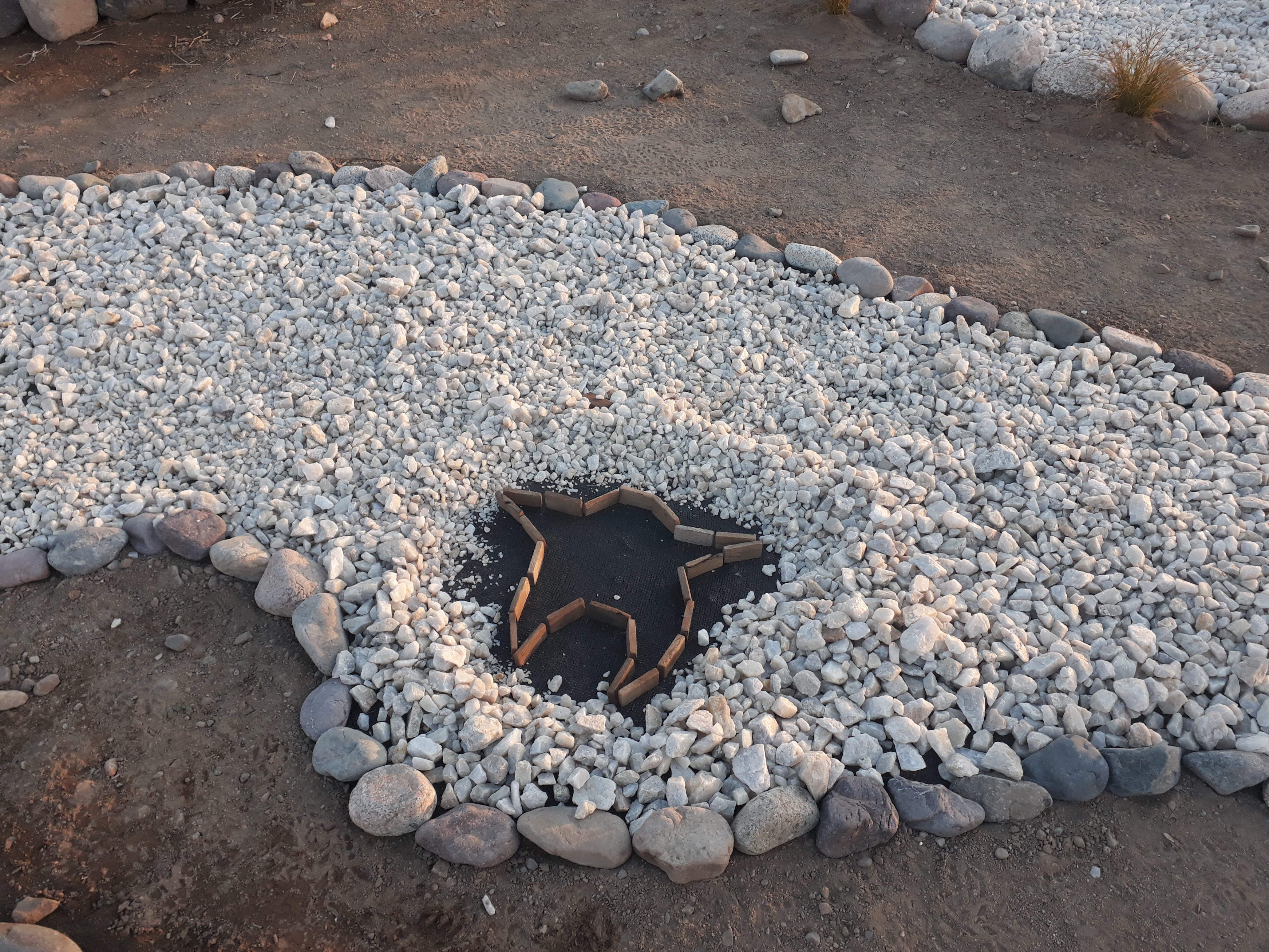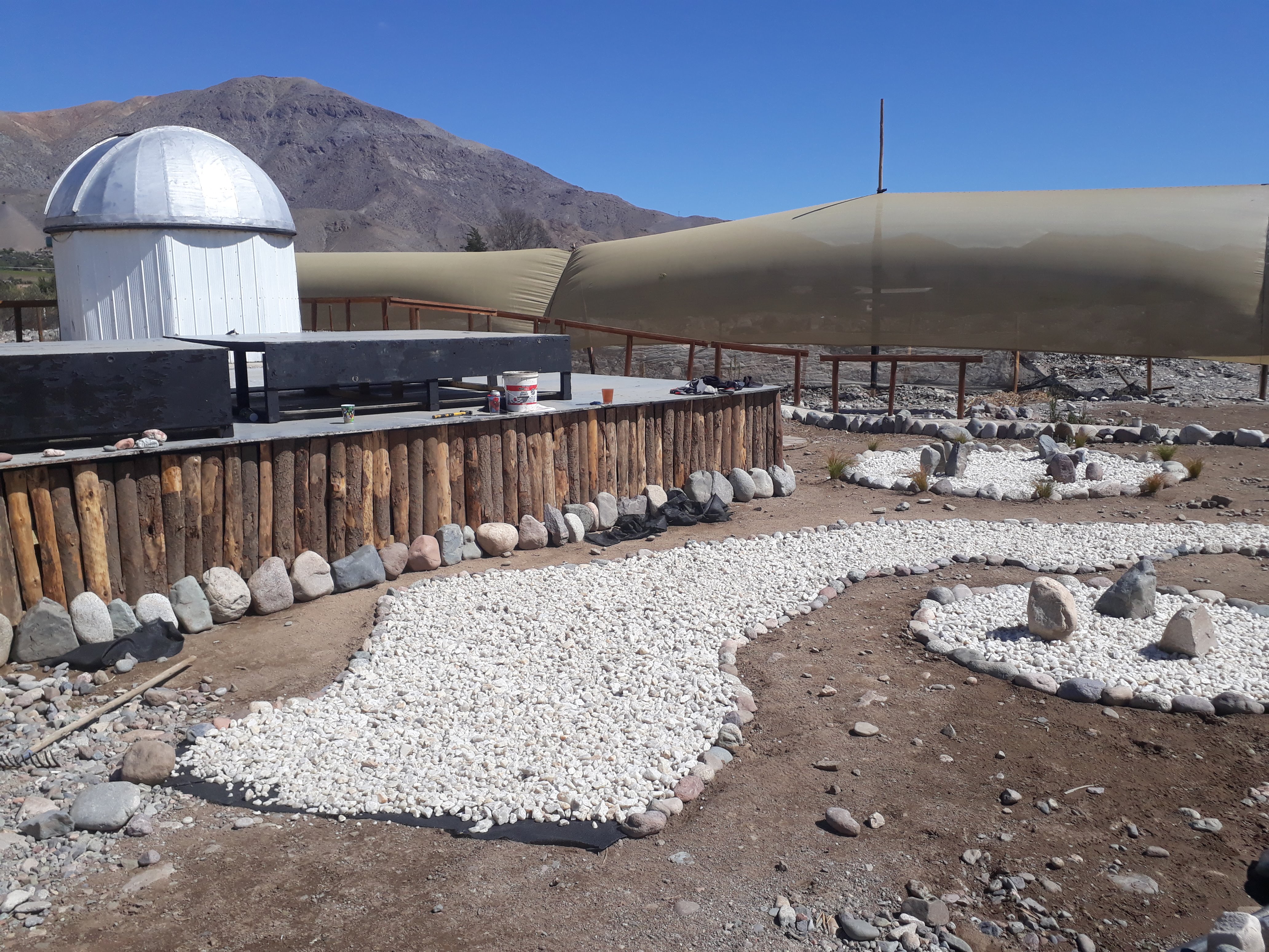 Les incas ayant étendu leur empire jusqu’à cette partie du Chili et leur culture s’étant mêlée pendant longtemps aux peuples locaux, nous avons décidé de créer notre première œuvre pour le jardin pédagogique sur ce thème. L’installation s’est faite devant l’observatoire de l’écohôtel et le matériel utilisé était : une toile de paillage noire (géotextile) découpée pour faire le fond et tenue par des clous et des grosses pierres ; des quartzs blancs, nombreux dans cette région, et des cailloux noirs pour dessiner les constellations ; des morceaux de bois rectangulaires collés au géotextile et découpés en bandelettes pour faire des séparations entres les pierres de différente couleur. Les photos ci-dessous présente les différentes étapes de la création.