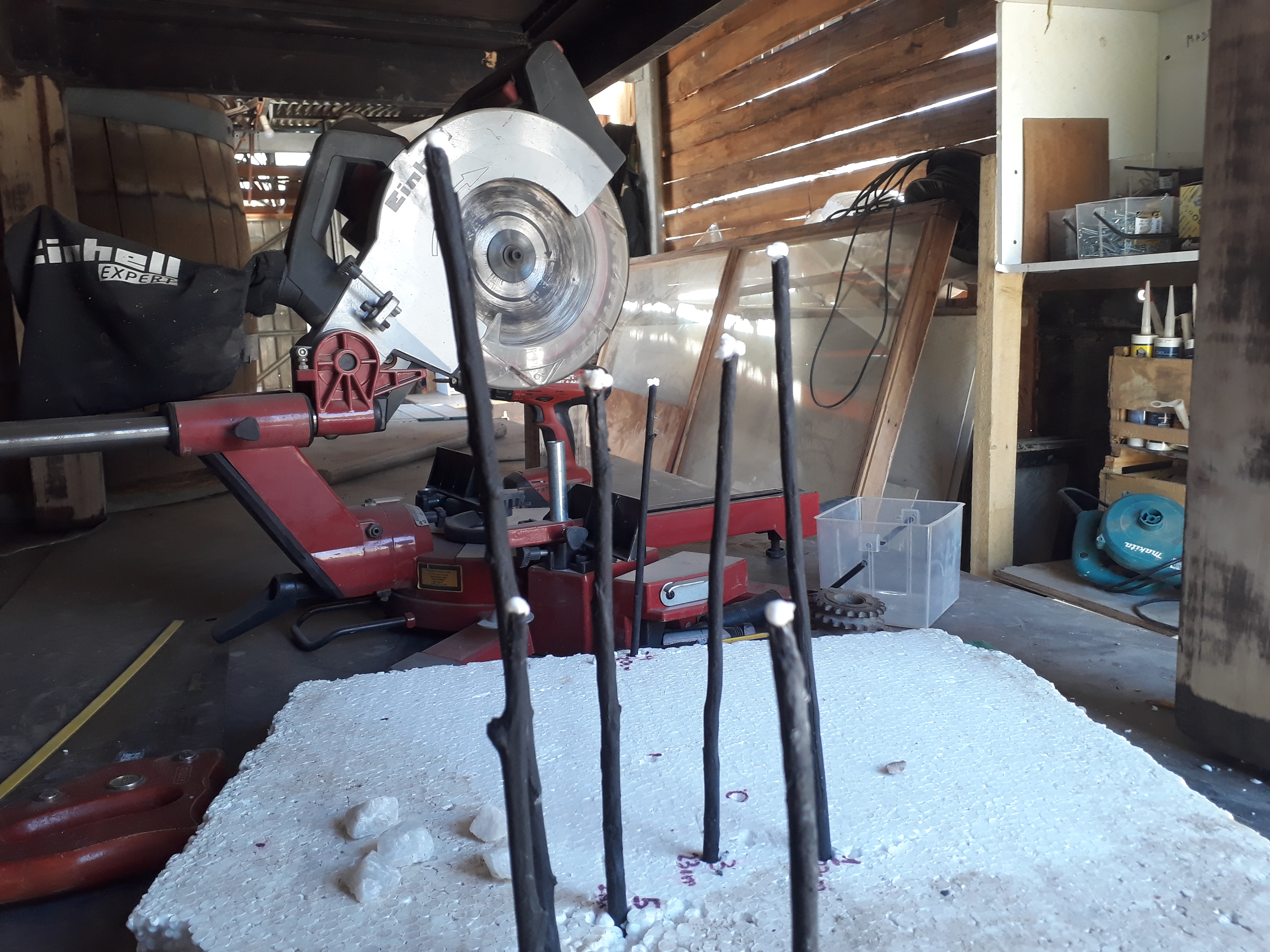 Placer l’extrémité du bout de ficelle sur le point de vue de la Terre et la connecter à la première étoile. A l’aide d’une règle ou d’un mètre, mesurer la distance Terre-Etoile en partant du point de vue de la Terre. Planter le bâtons dans le polystyrène à cet endroit et le couper au niveau du passage du bout de ficelle. Réitérer pour chaque étoile. Cette maquette peut déjà être utilisée pour une animation, le jeu étant de tourner autour (ou de la faire tourner) pour trouver le point de vue de la Terre. Son avantage est qu’elle est transportable. Ou elle peut être utilisée pour construire une maquette beaucoup plus grande.