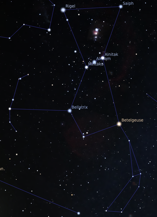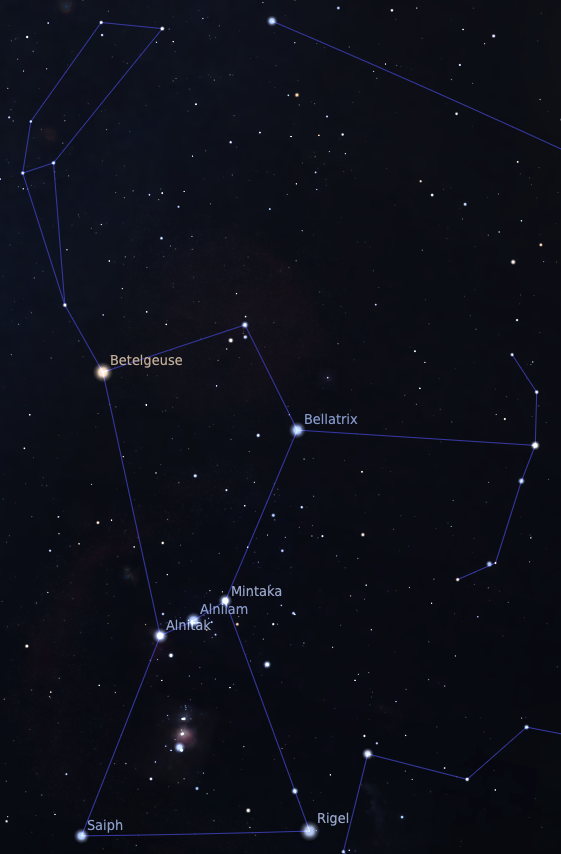 Ci-dessous deux images d’Orion extraites de Stellarium, la première depuis la France et la seconde depuis le Chili, et une image avec annotations en espagnol mettant en avant les trois étoiles composant « Las tres Marías ». On notera que la position des étoiles est inversée avec le changement d’hémisphère et qu’Orion au Chili a la tête en-bas !