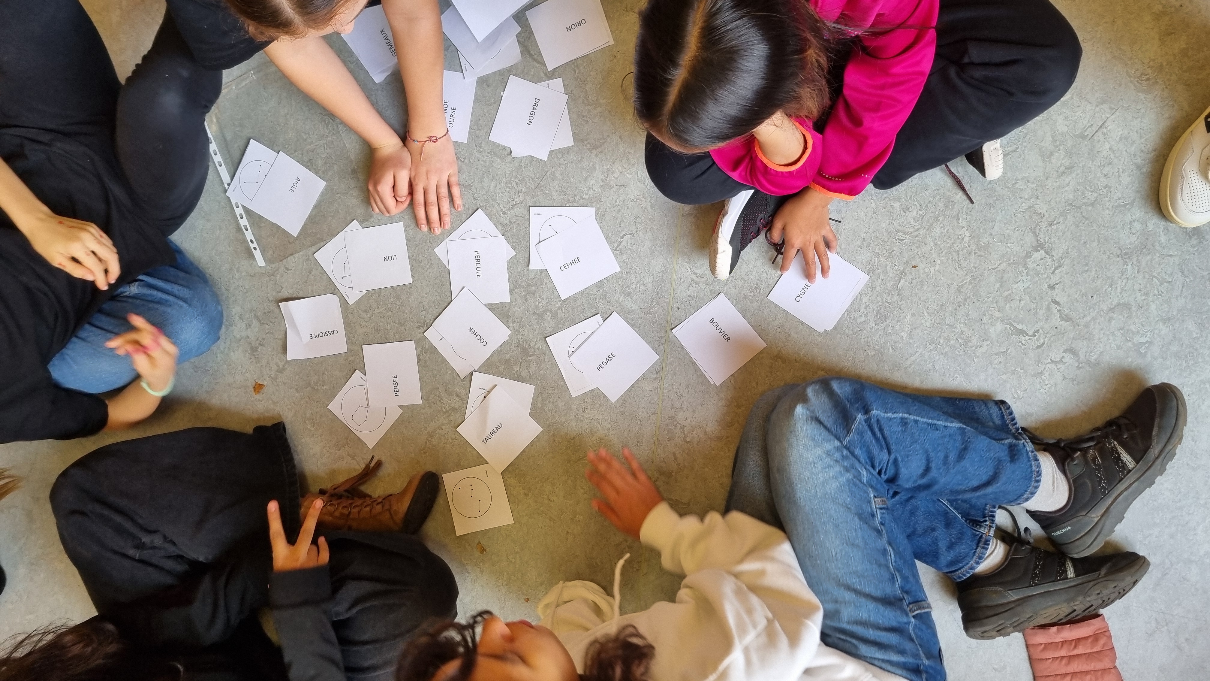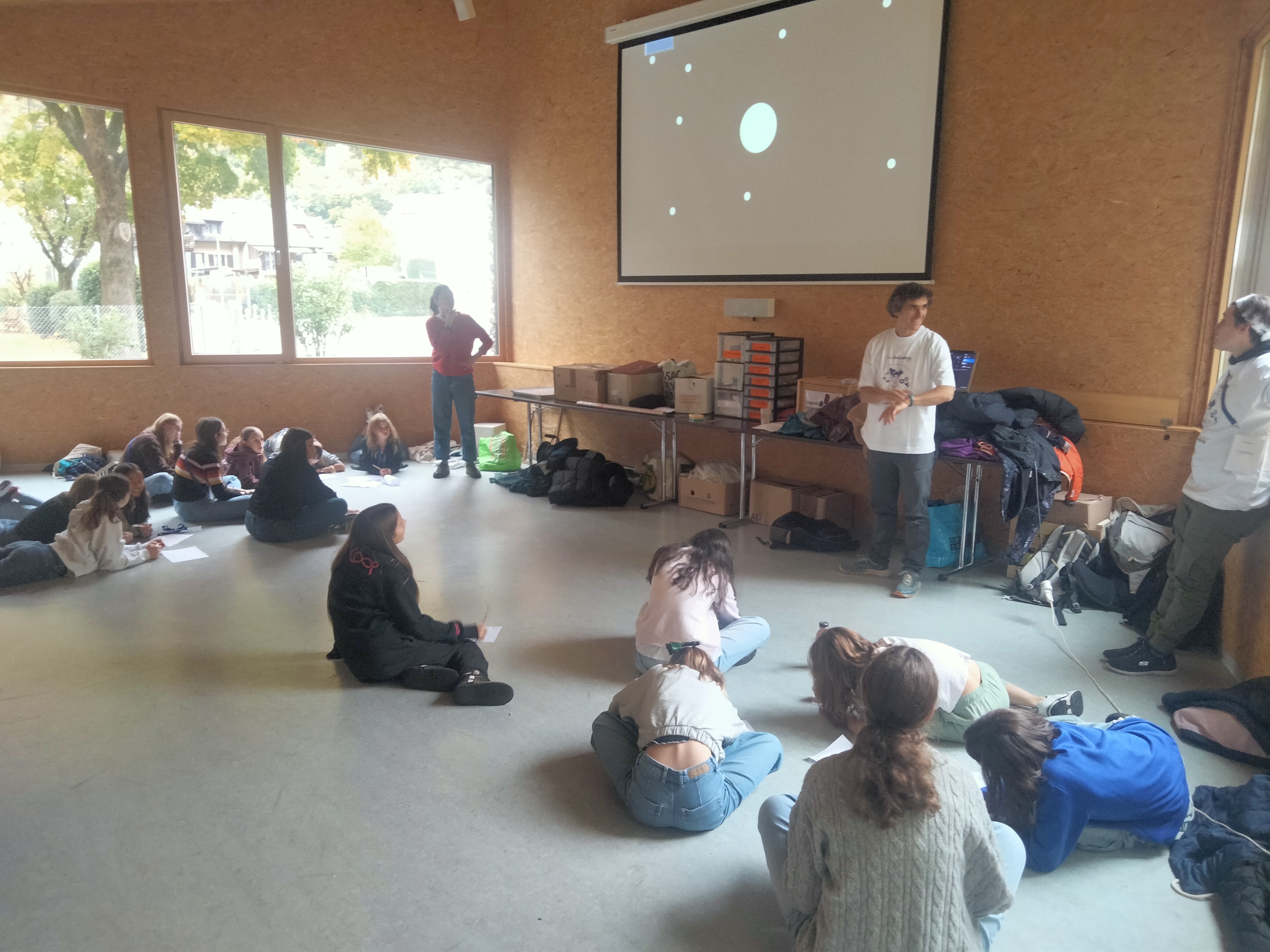 Nous avons commencé par l’explication du programme et des différents temps forts. Puis, c’est parti pour l’astronomie ! Tout d’abord, il était utile de clarifier quels sont les objets du système solaire, dans quel ordre ils se trouvent, et quelques étranges propriétés de ces différentes planètes. Nous avons également constaté que si notre planète faisait 7 cm, le Soleil serait grand comme la pièce ! (et la pièce est grande !)