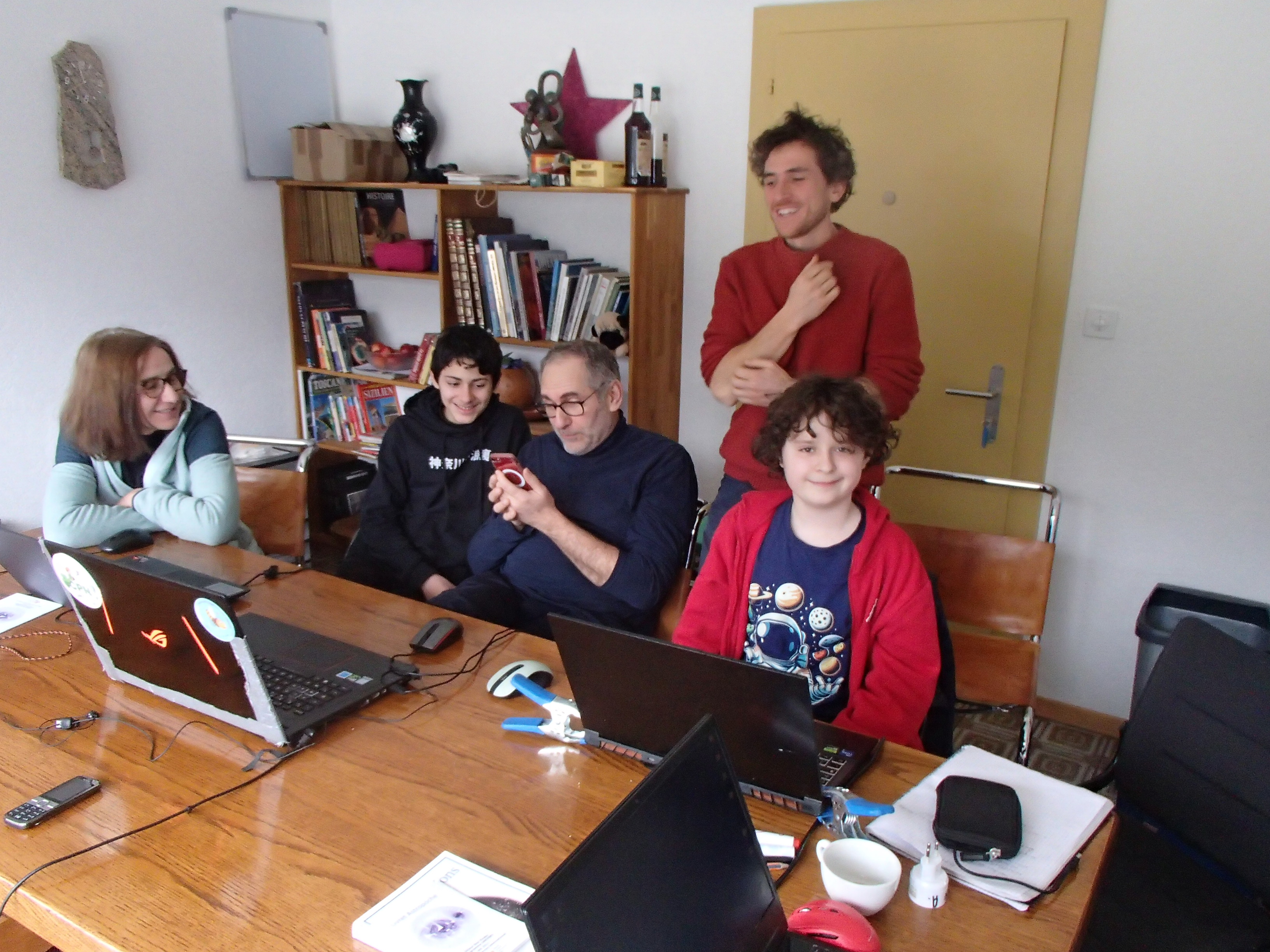 Une première chouette journée ! Nous avons commencé par une matinée pour reprendre en douceur les bases de l’astronomie, histoire de se plonger dans le bain. Beaucoup de questions comme souvent dans ce domaine. L’après midi fut consacrée au matériel et à sa mise en place ainsi qu’à l’analyse de la météo... En effet, une soirée mi figue mi raisin est annoncée... peut être une première occasion d’observation... Et bingo ! Le ciel est même plus dégagé que prévu. Du coup, début de soirée avec le logiciel de planétarium stellarium, suivie d’une mise en pratique, Adam a pu pointer sa nouvelle lunette sur Jupiter et même la grande nébuleuse d’Orion... super chouette ! Nous avons aussi sorti la lunette et le Dobson de 250 mm d’OSI... et même la grosse monture pour prendre des photos de Jupiter et de la Galaxie de Bode (M 81)... nous verrons aujourd’hui ou demain ce que cela donne mais le matériel est en place, et des soirées très correctes sont encore prévues mercredi et jeudi !