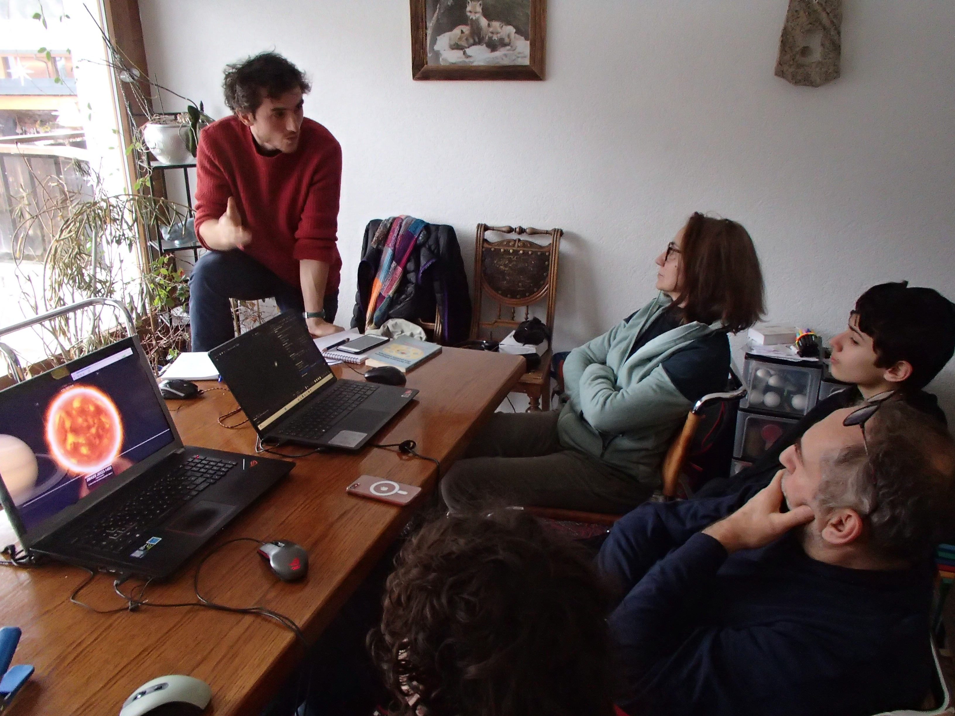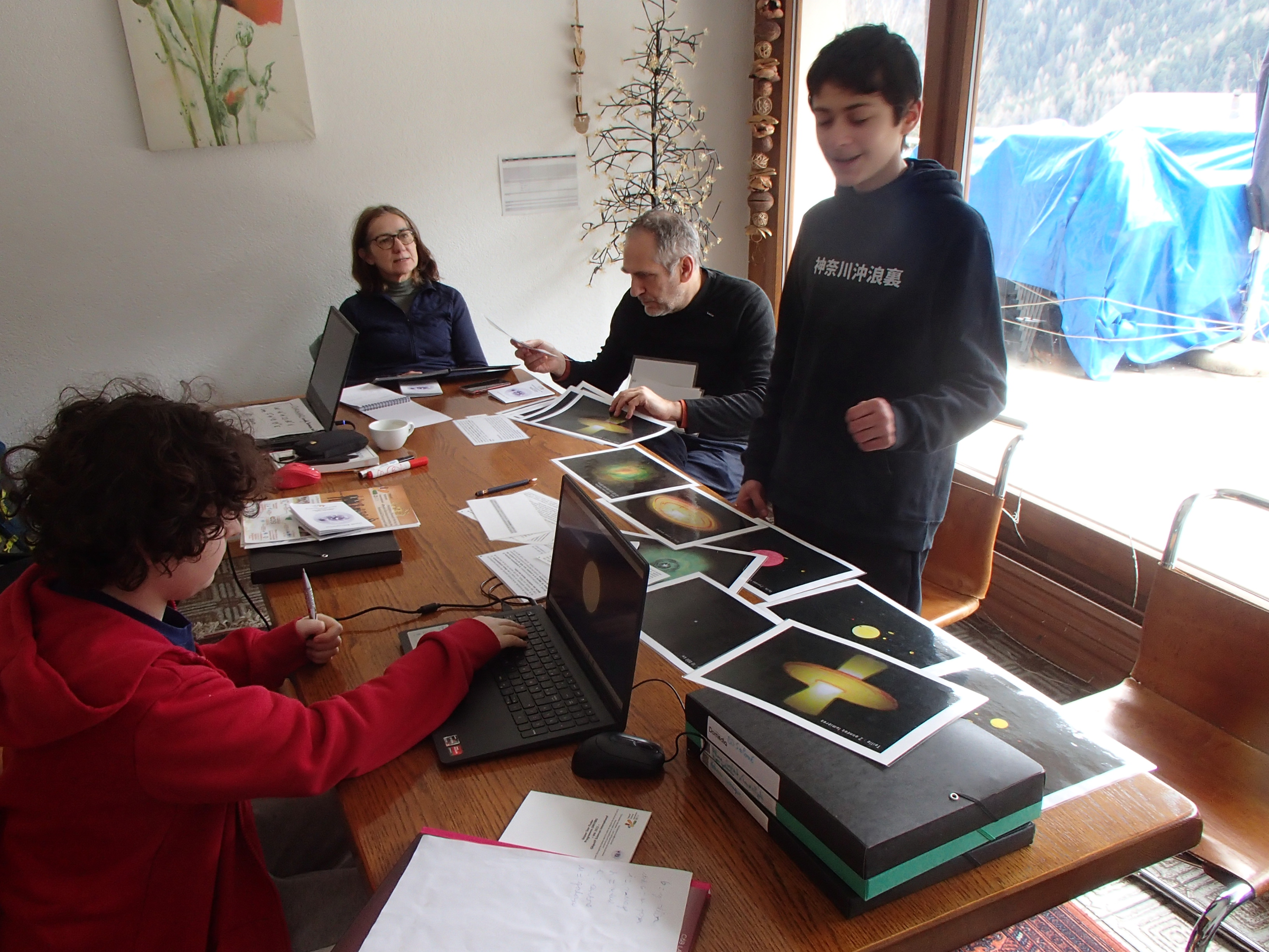 La matinée est placée sous le signe de la structure du soleil, puis sur la lune (formation, reliefs, lunaisons...) pour Isabelle et Adam, pendant que Frédéric et Nehuén partent profiter des pistes et de la neige fraîche tombée hier.