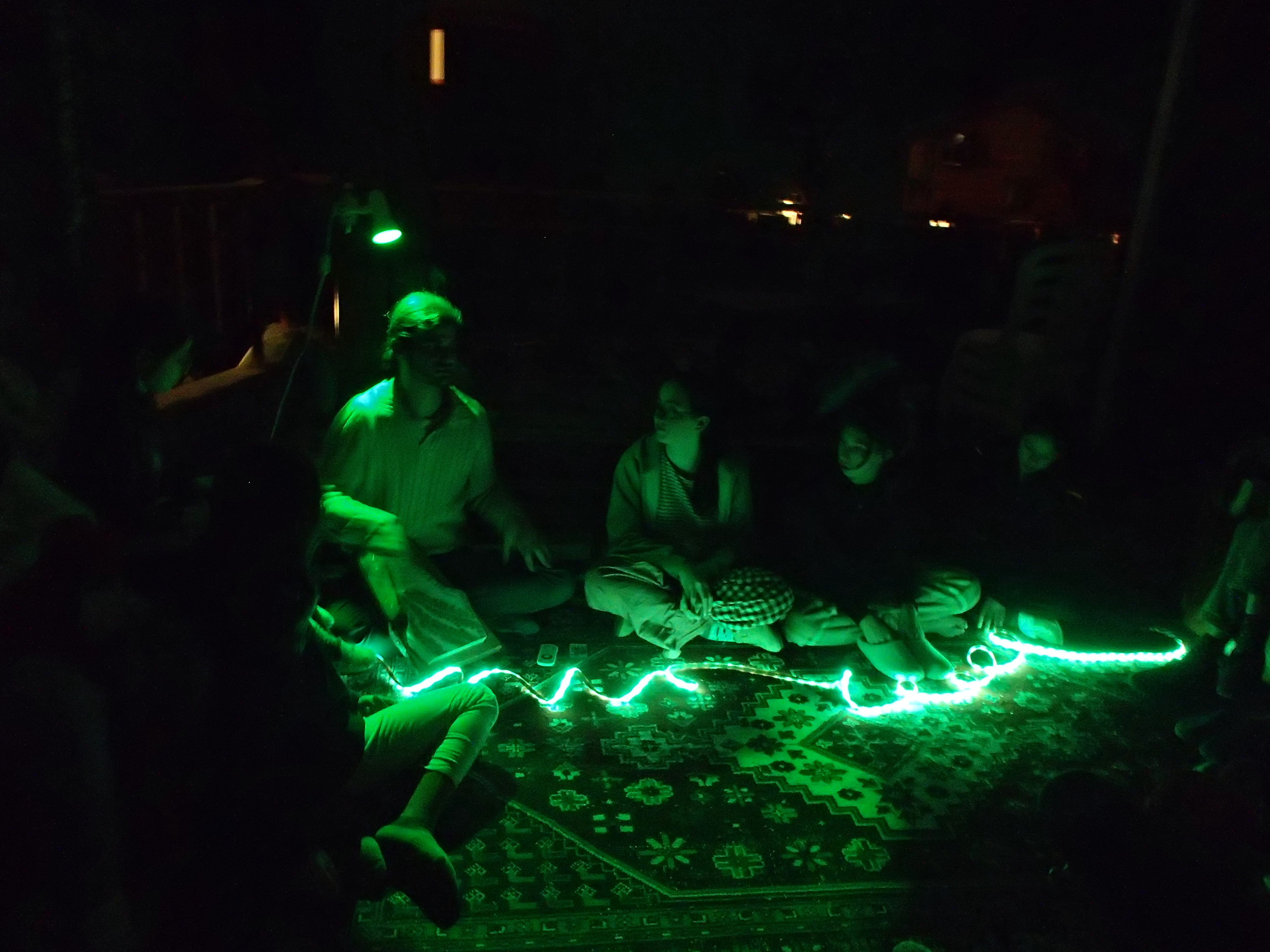 En veillée, encore une petite sortie astro pour les adultes, Adam, après avoir participé au choix de l’exoplanète ciblée ce soir, préfère quand à lui rester au chaud avec les autres... l’appel du Loup-garou est la plus forte !