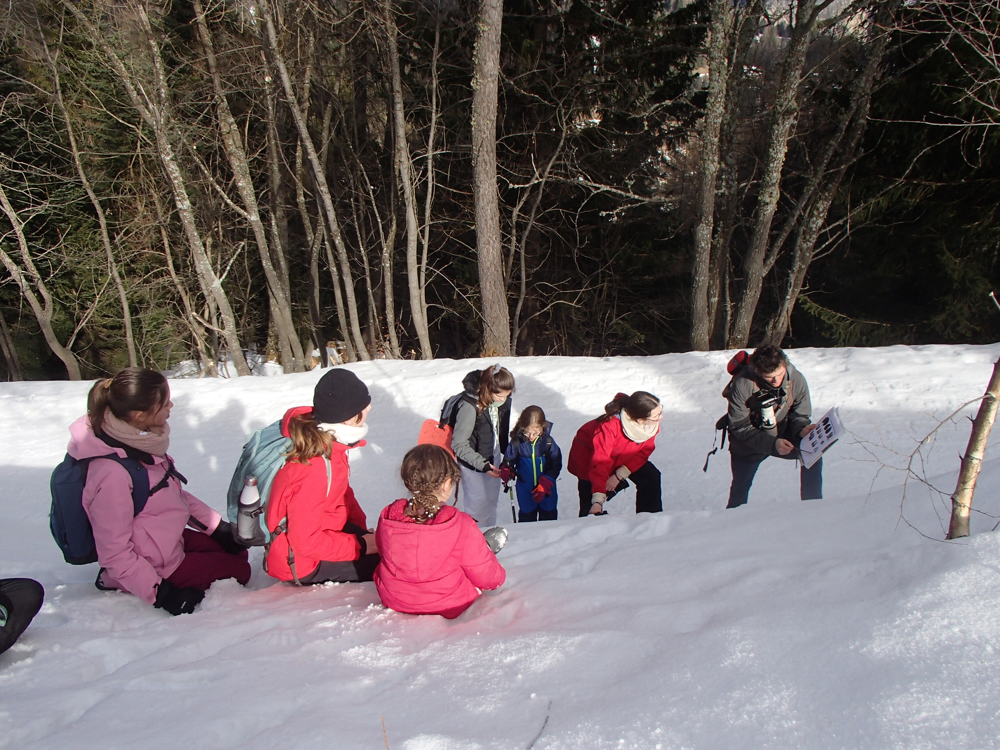 Pique-nique au soleil, puis nous nous divisons en deux groupes pour faire des « transects » de pistes d’animaux, exercice qui rentre dans le protocole d’étude du groupe qui travaille sur le retour du loup. Quelques descentes encore, en partie en luge pour certains, nous ramènent vers un bon goûter.