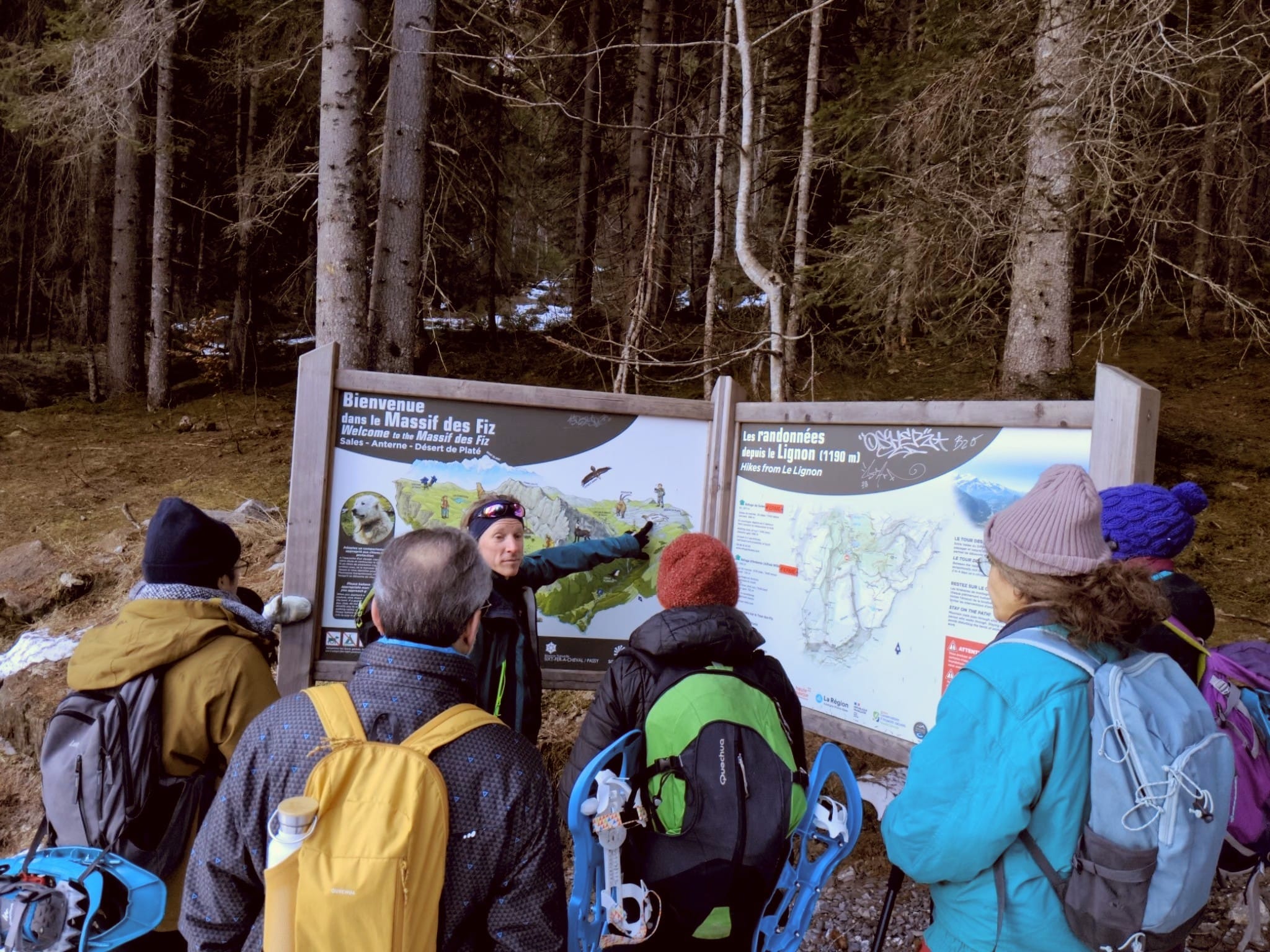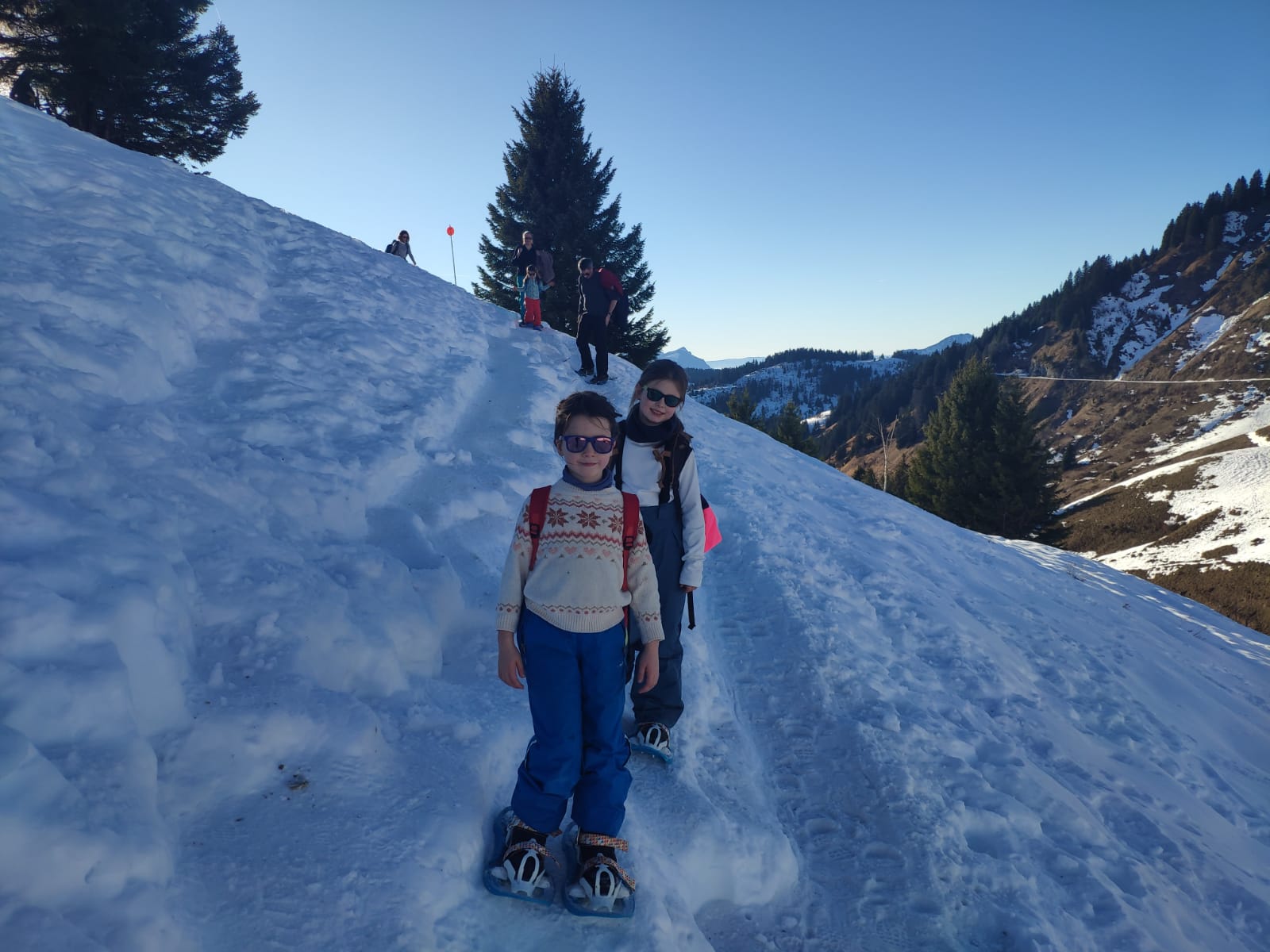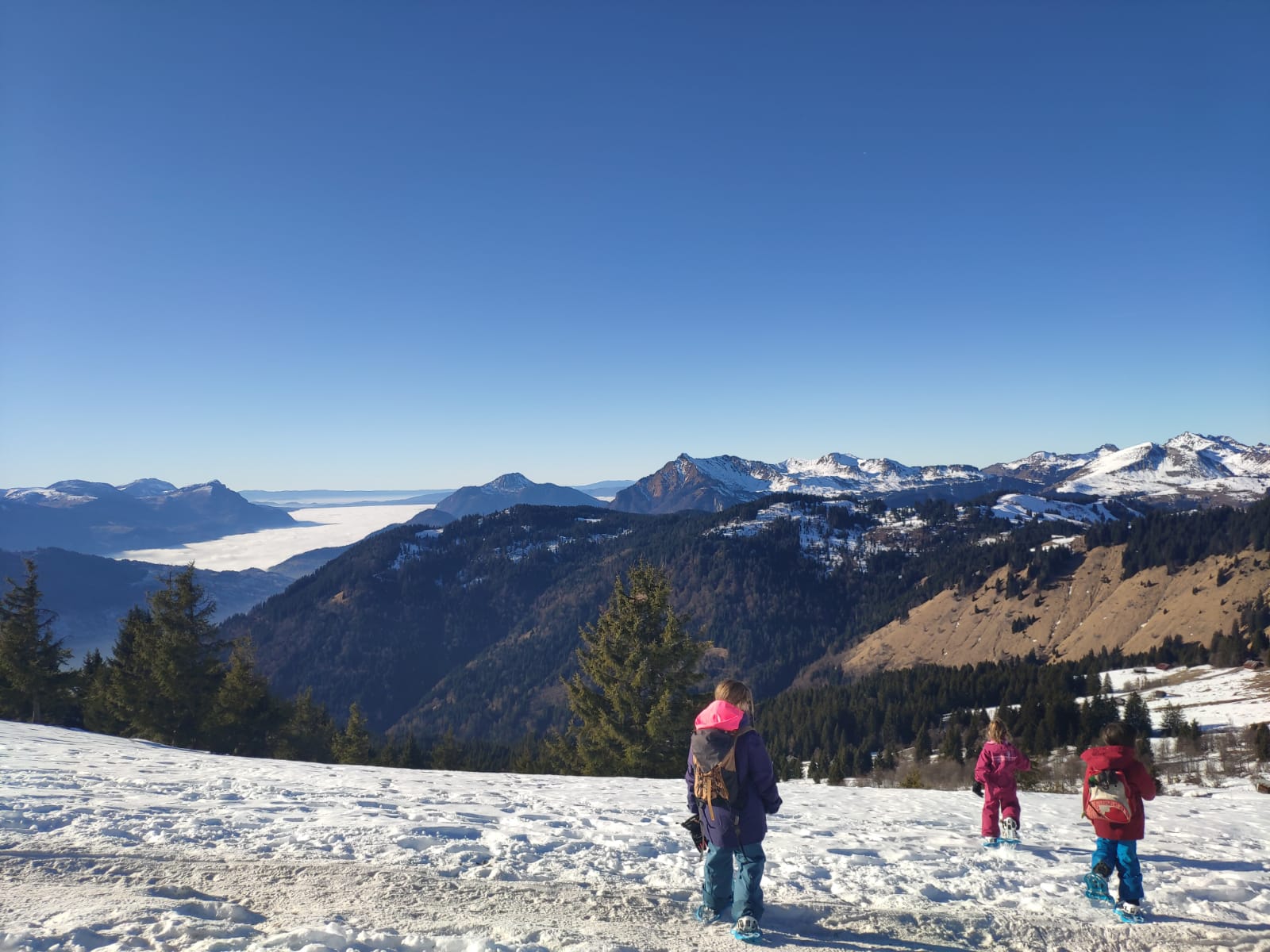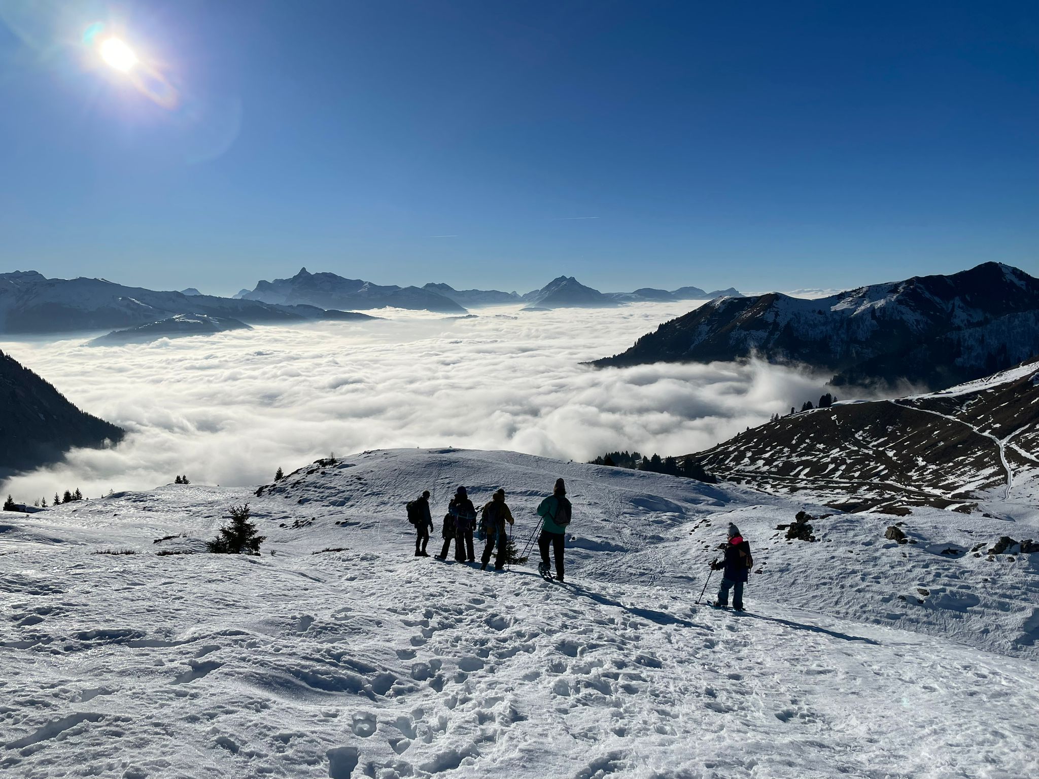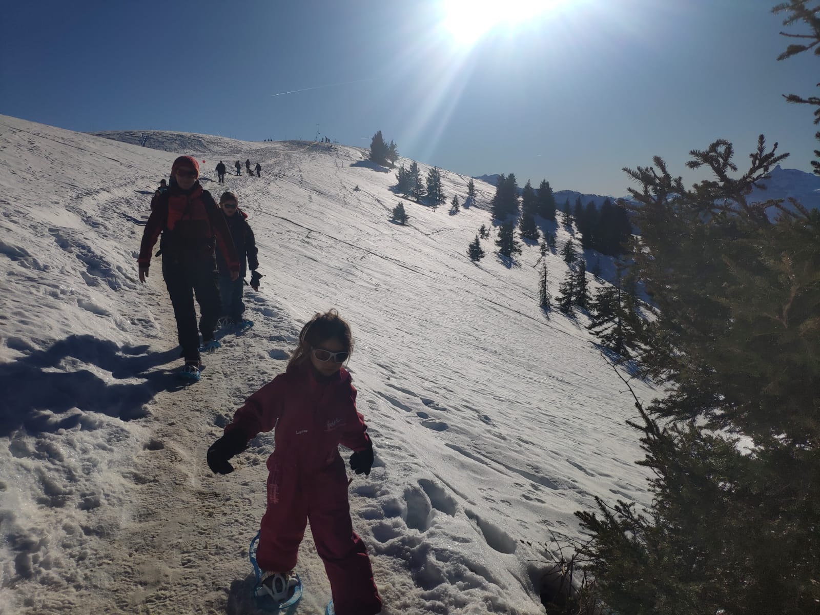 Aujourd’hui, nous avons profité d’une belle journée pour gravir les montagnes. Après une montée en bus au col de Joux Plane à 1700 m d’altitude, nous avons chaussé les raquettes. Le groupe était vraiment en forme, il y avait les « fusées » à l’avant du peloton qui donnaient un rythme d’enfer. En 1h30, nous avons rejoint le sommet de la Bourgeoise : l’endroit idéal pour pique-niquer face au Mont Blanc, le panorama était incroyable !