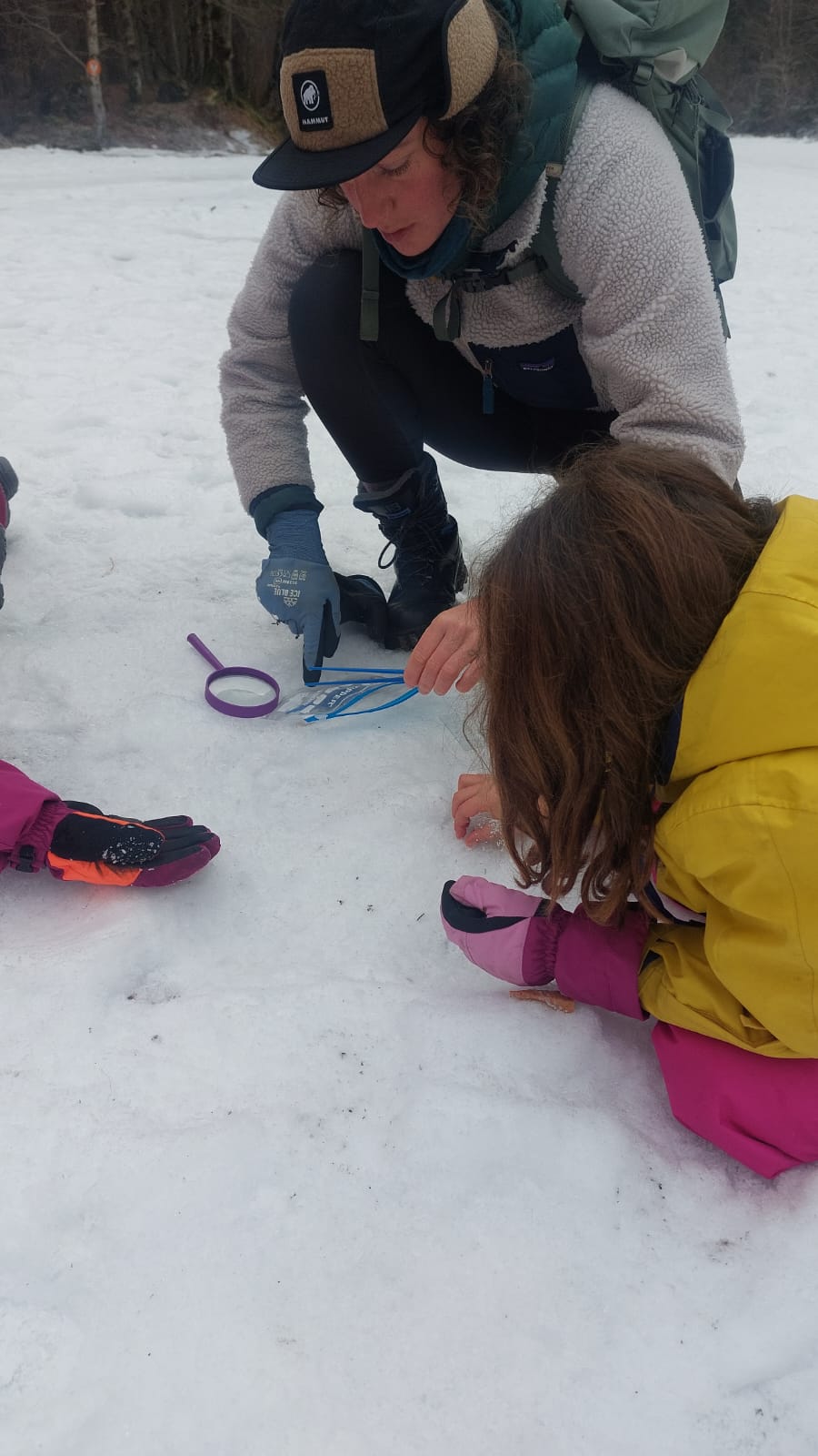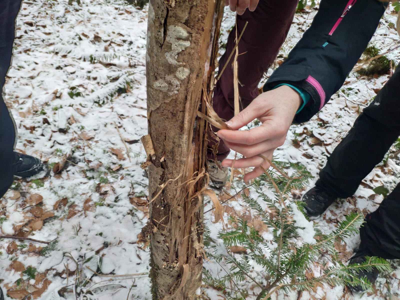 Nous avons vu des empreintes de lièvre variable, de canidés, identifier des essences d’arbres et surtout appris à marcher avec des raquettes !