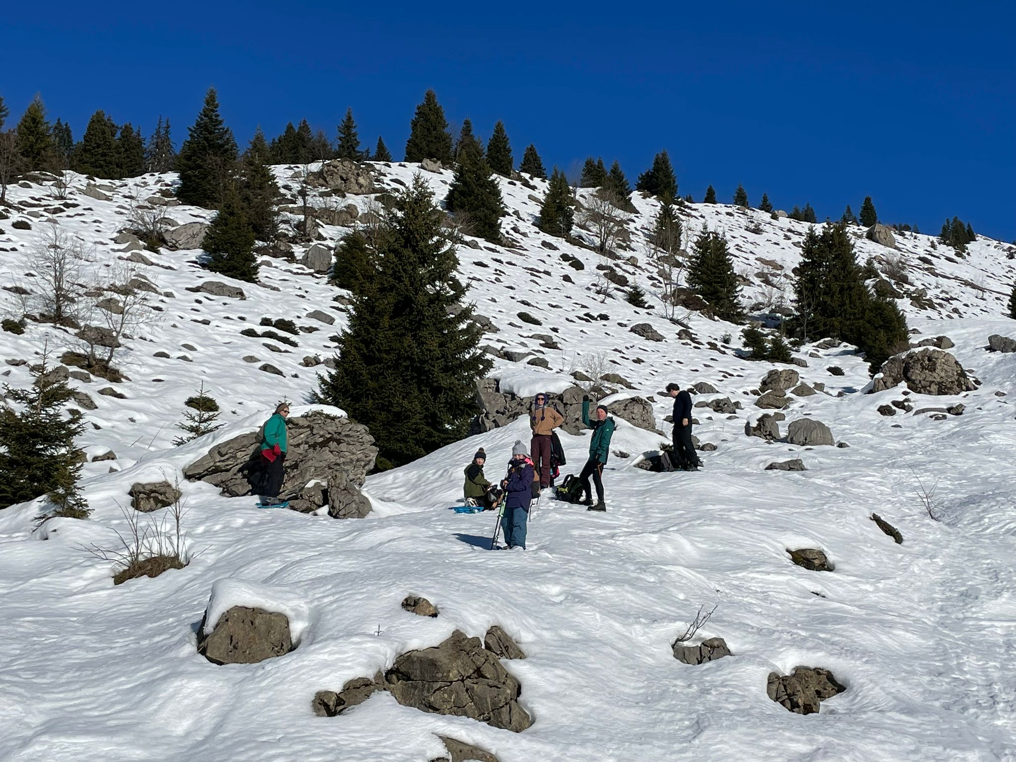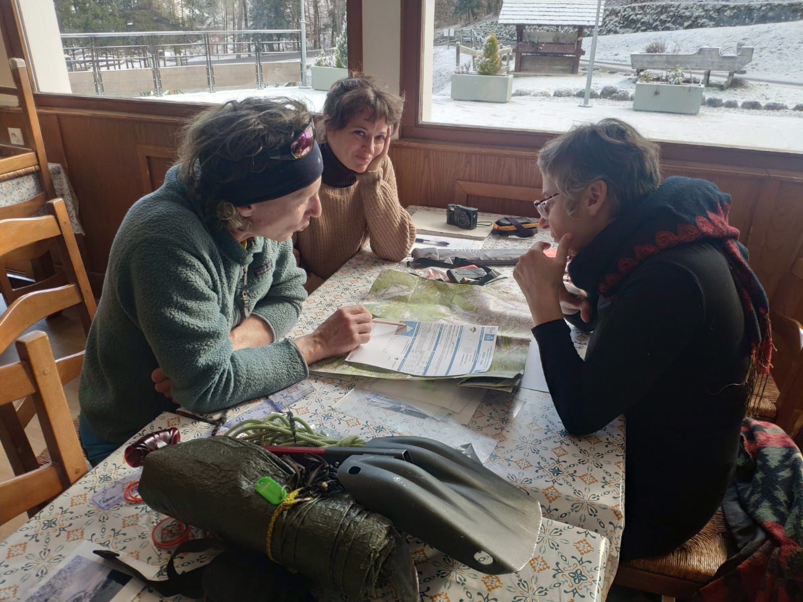 Puis, au cas où (malgré le peu de neige), nous avons travaillé sur la prévention des avalanches et le secours aux victimes. Surprise : le chien du gîte a trouvé le premier DVA de l’exercice pratique de recherche ! Mais, bien heureusement, survivante de cette matinée, Amélie a su sauver les trois autres.