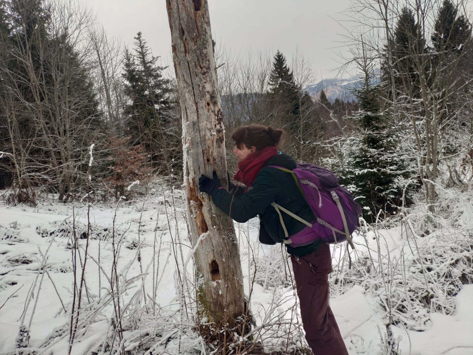 Et… CHUT ! On écoute une mésange boréale. AH ! Et ici, un pic. Mais… ces pics ont fait des trous partout dans les troncs pour chercher à manger ! L’un d’eux a même attaqué une fourmilière et y a laissé une petite crotte blanche.