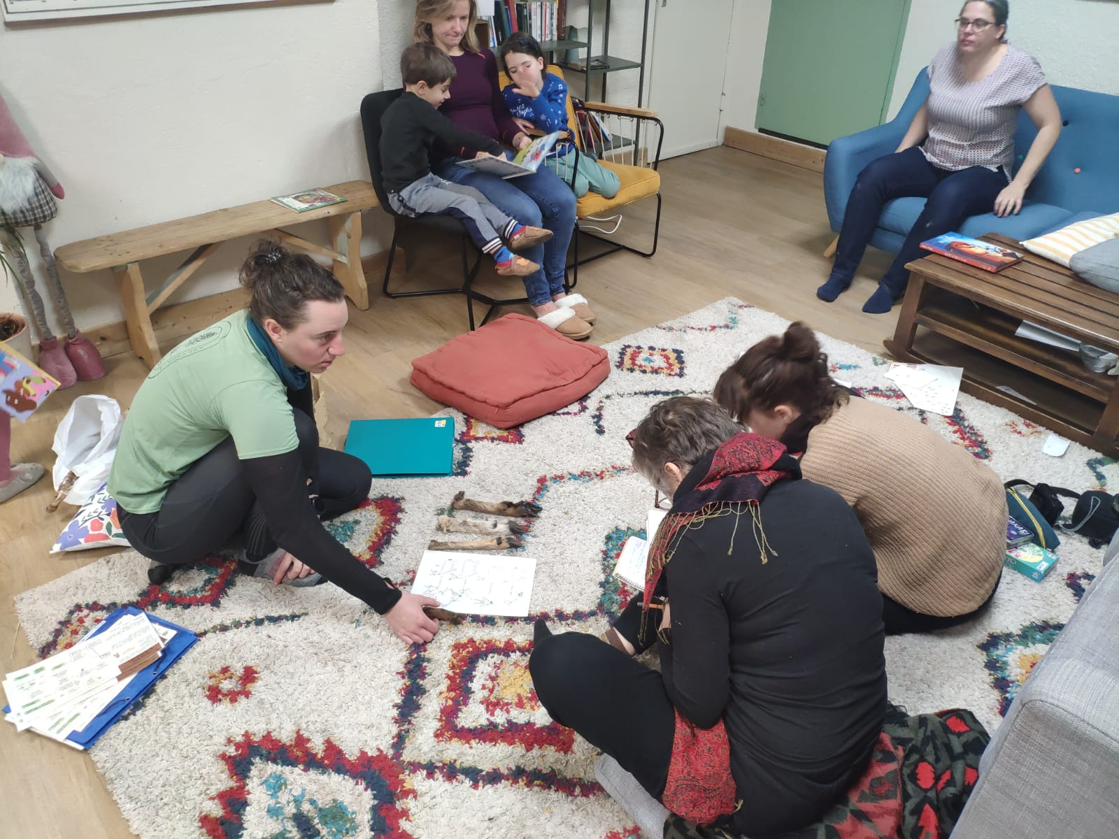 Ce matin, trois ateliers. Le premier : assis·e·s confortablement sur des tapis, nous avons découvert et identifié des crânes, cornes, bois, os, pattes et crottes d’animaux de montagne. Nous étions ainsi prêt·e·s pour les recherches de traces de l’après-midi.