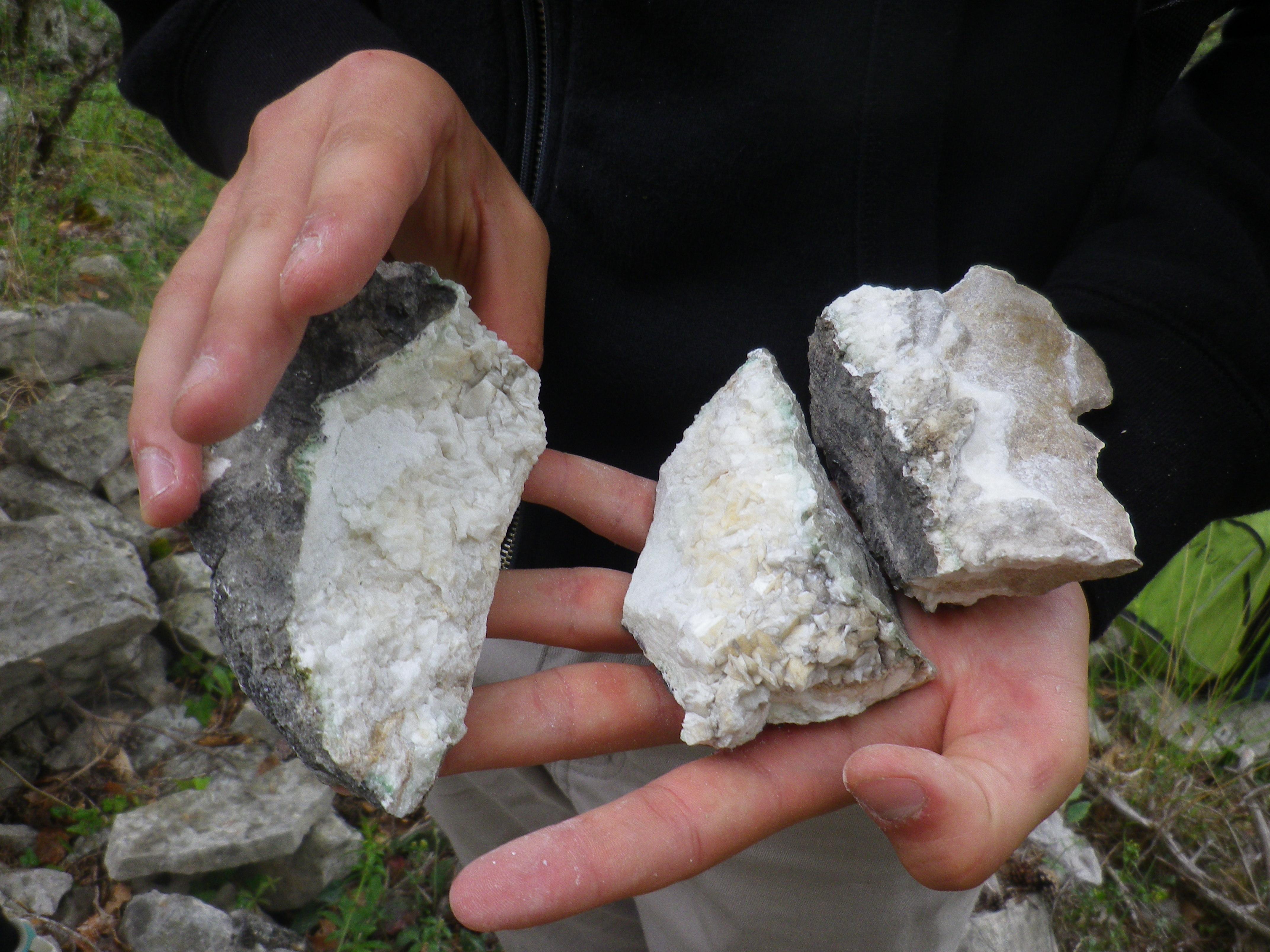 Après avoir traversé de nombreux petits sentiers de randonnées en amont du centre, nous sommes arrivés dans une clairière de papillons dans laquelle nous attendait une mini colline de roche calcaire et de marne. Grâce à nos marteaux de géologue et notre flair scientifique, nos fouilles ont été très fructueuses : de la calcite à gogo et quelques fossiles (ou empreintes de fossiles)....