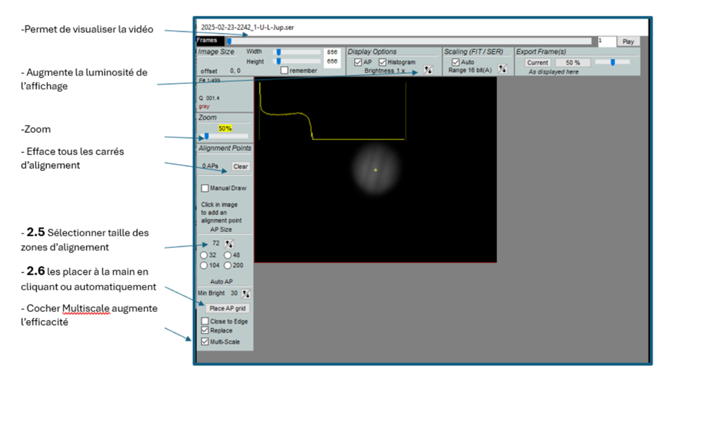 Nous avons utilisé Firecapture pour piloter la caméra et faire 32 vidéos de 90 secondes. Puis Autostakkert pour traiter toutes les vidéos d’un coup (tellement pratique). Dans notre cas, il s’est avéré que le drizzle x 3 était probant (c’est un paramètre à utiliser en condition de sous-échantillonnage). Puis le logiciel Astrosurface pour faire ressortir les détails, comme pour Autostakkert, une fois les bons paramètres trouvés, on peut le faire tourner sur toutes les vidéos en même temps. Il reste une étape à explorer avec des logiciels d’empilement de photos en prenant en compte la rotation de Jupiter. Ci-dessous, des indications pour le logiciel AutoStakkert.