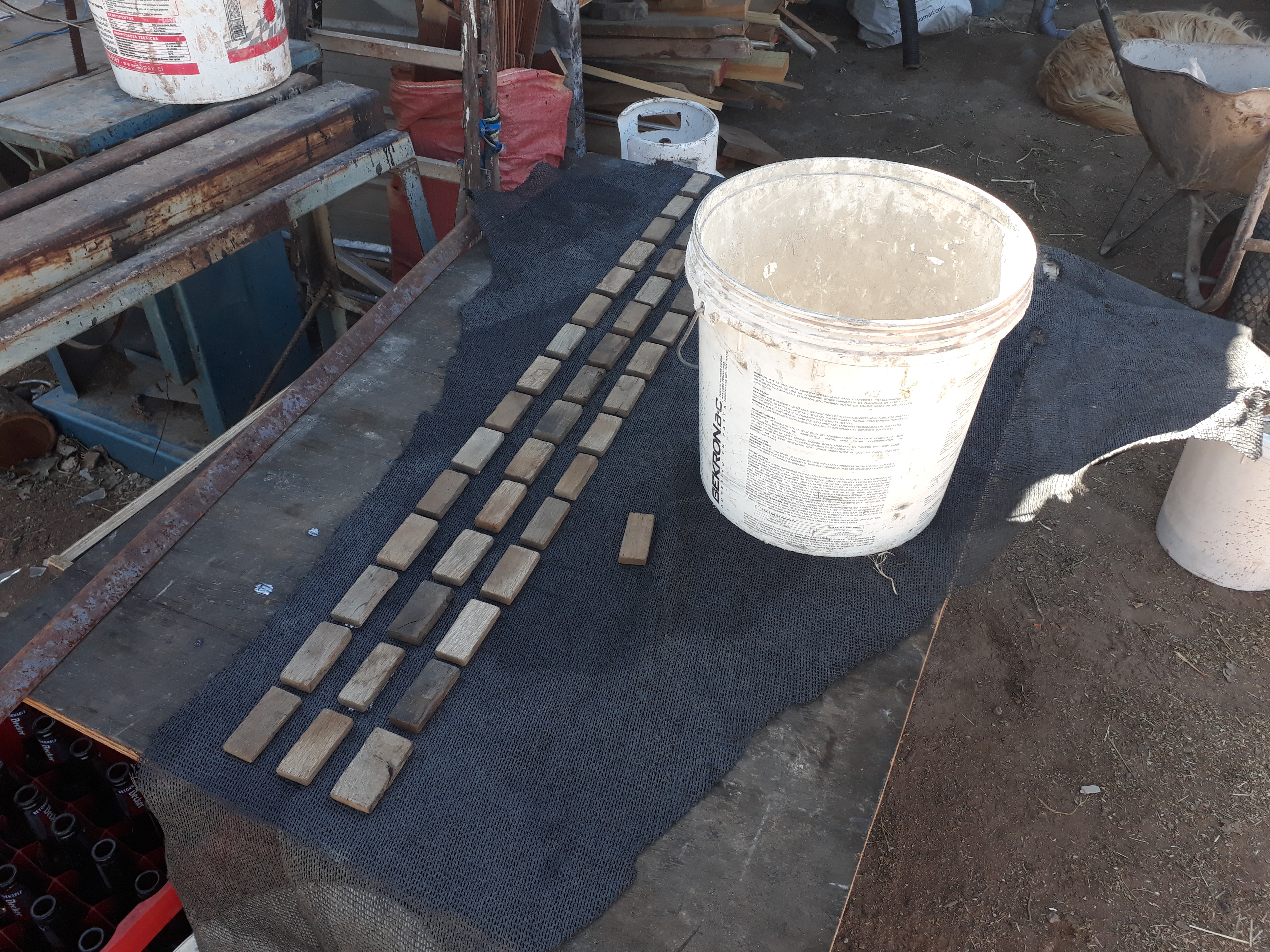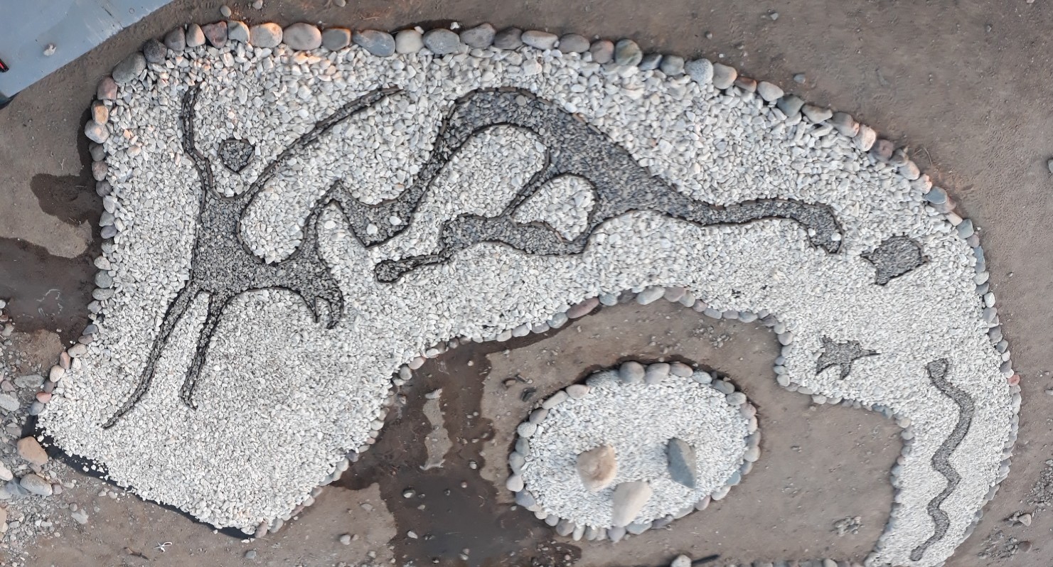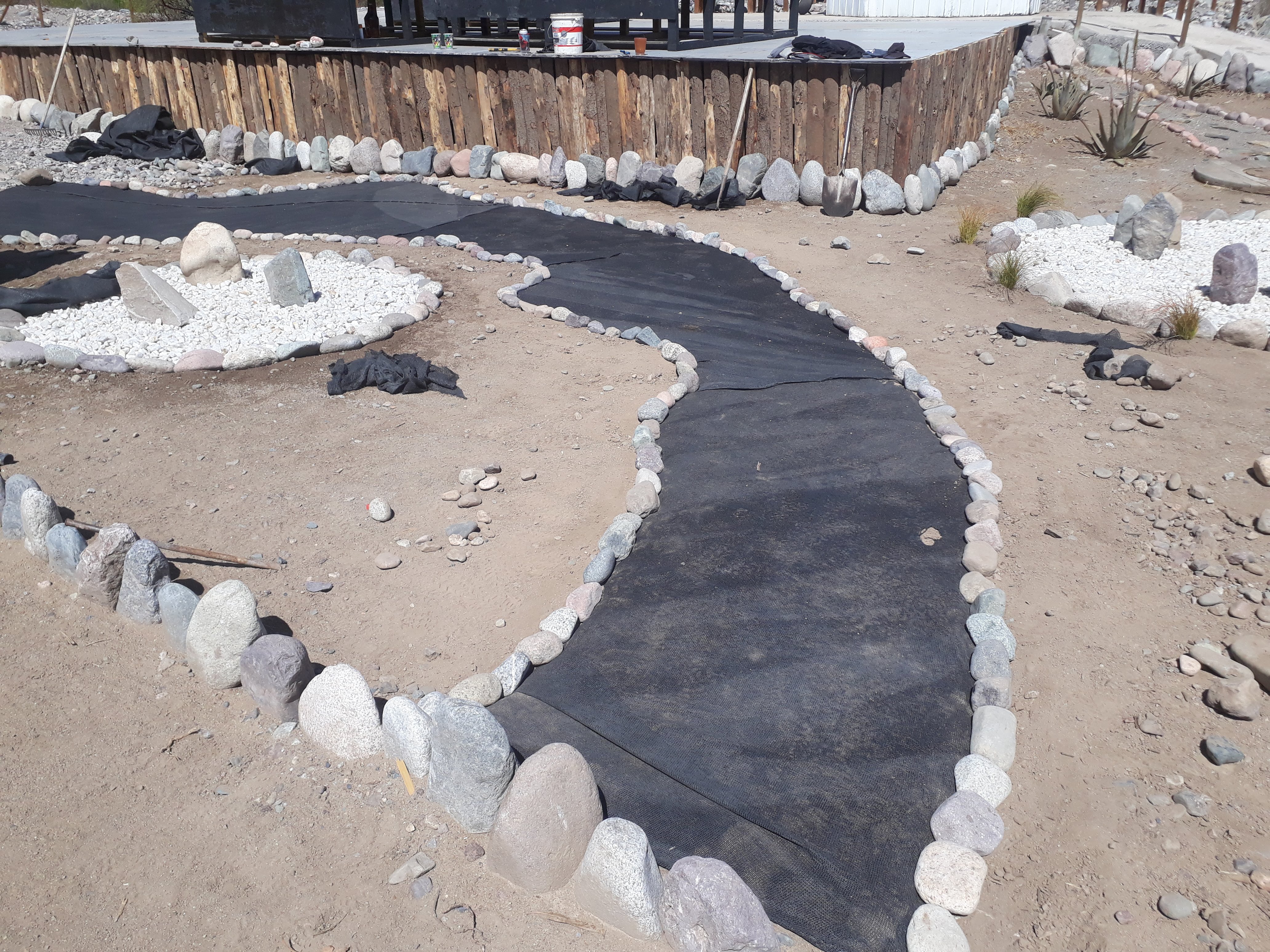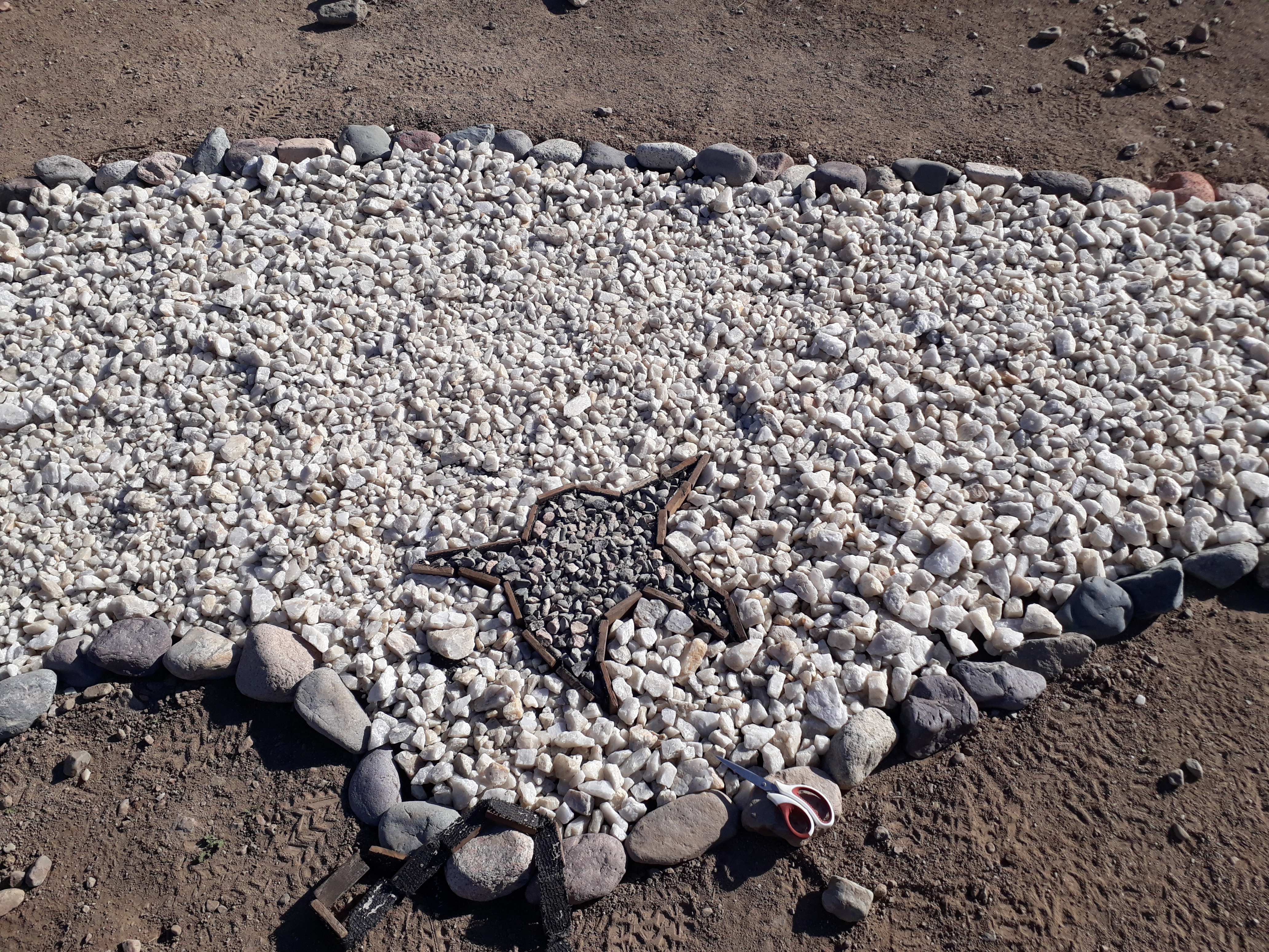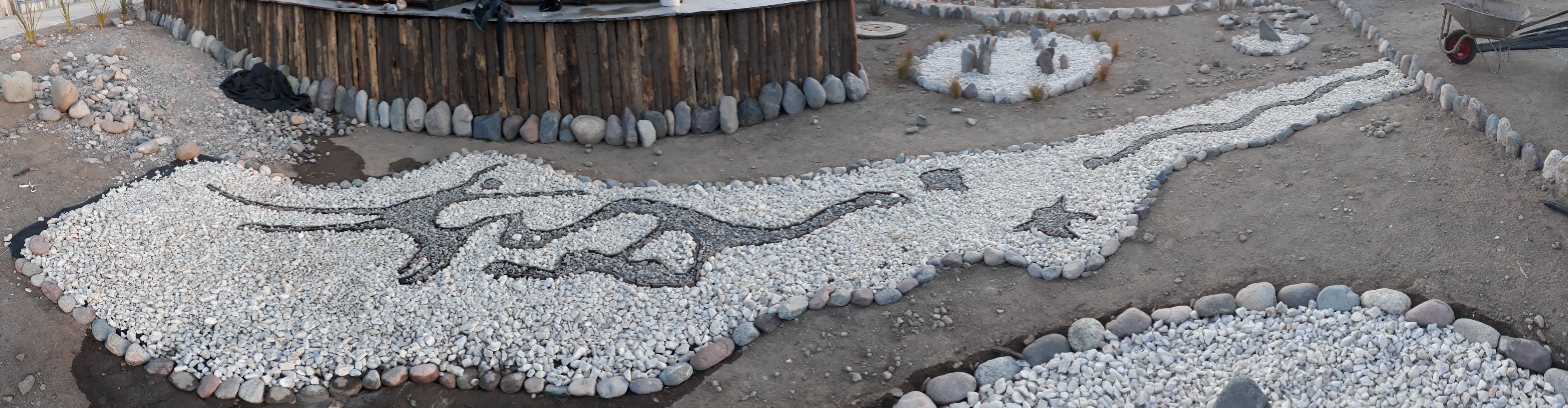 Les incas ayant étendu leur empire jusqu’à cette partie du Chili et leur culture s’étant mêlée pendant longtemps aux peuples locaux, nous avons décidé de créer notre première œuvre pour le jardin pédagogique sur ce thème. L’installation s’est faite devant l’observatoire de l’écohôtel et le matériel utilisé était : une toile de paillage noire (géotextile) découpée pour faire le fond et tenue par des clous et des grosses pierres ; des quartzs blancs, nombreux dans cette région, et des cailloux noirs pour dessiner les constellations ; des morceaux de bois rectangulaires collés au géotextile et découpés en bandelettes pour faire des séparations entres les pierres de différente couleur. Les photos ci-dessous présente les différentes étapes de la création.