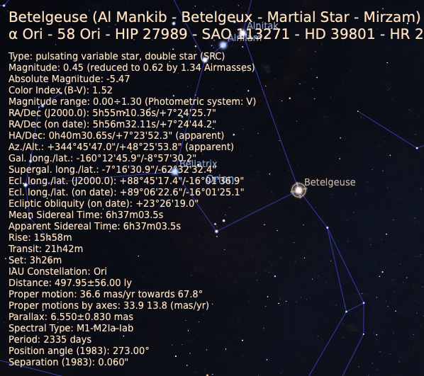 La première étape pour fabriquer la maquette est d’ouvrir Stellarium et de noter la distance à la Terre de chaque étoile de la constellation. Pour cela, il suffit simplement de cliquer sur l’étoile choisie et ses informations apparaitront. Par exemple pour Betelgeuse, nous noterons « Distance : 497,95 ly (années lumière) ». Pour Orion, seule les Sept plus brillantes, formant le « sablier », seront choisies.