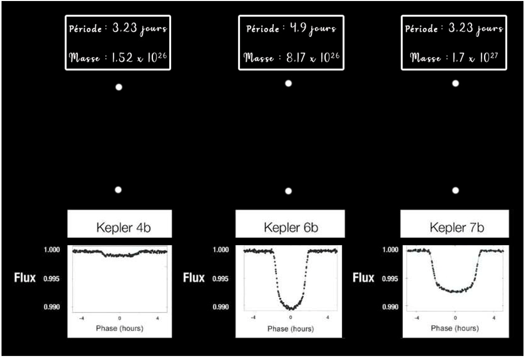 Pour mieux comprendre, nous te proposons la mission suivante : relier les caractéristiques des 3 exoplanètes à la courbe leur correspondant. Tu peux t’aider des explications dessous.