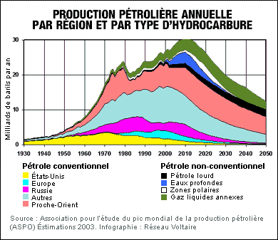D’après cette modélisation nous serions actuellement sur un plateau en ce qui concerne le pétrole dit conventionnel et nous atteindrions bientôt le pic global pour la totalité des ressources mondiales de pétrole.
