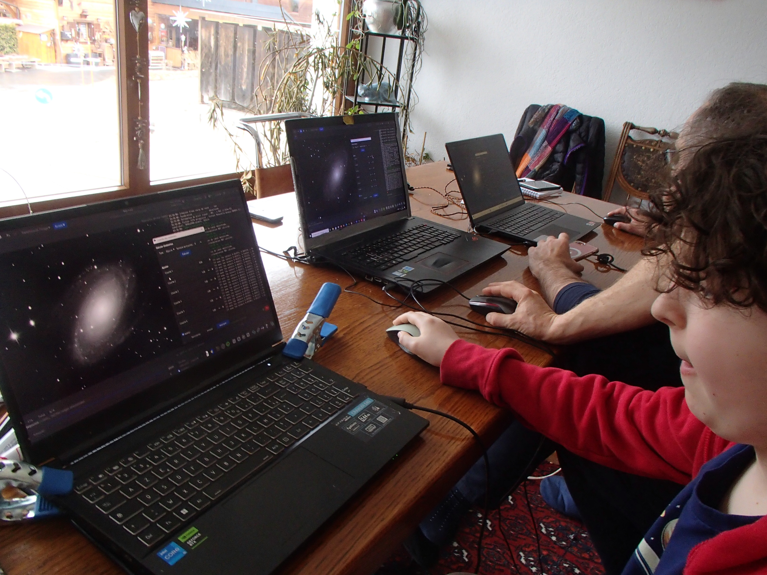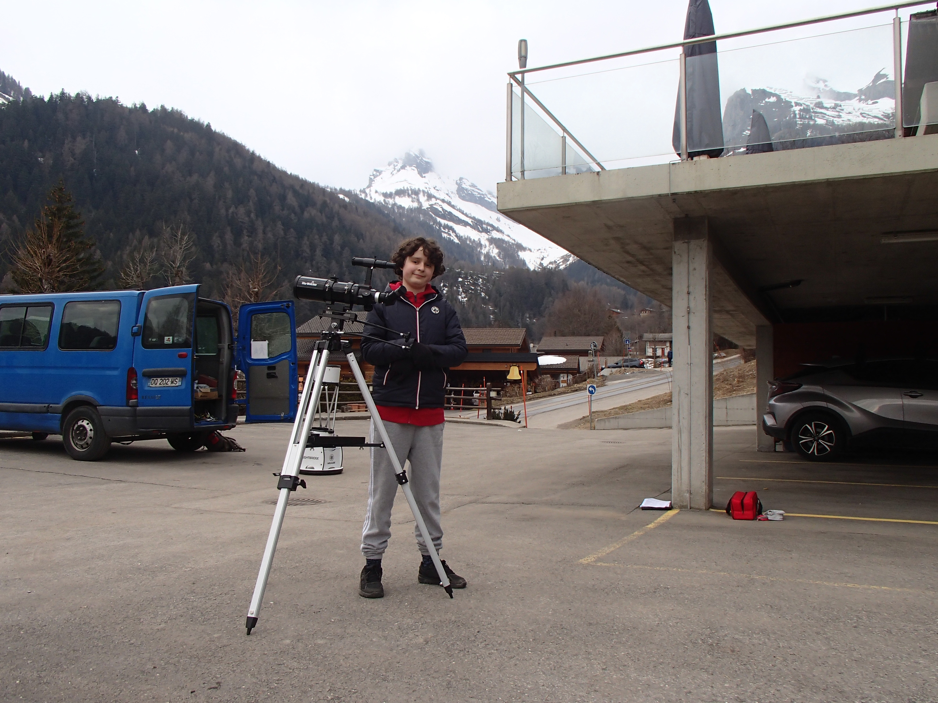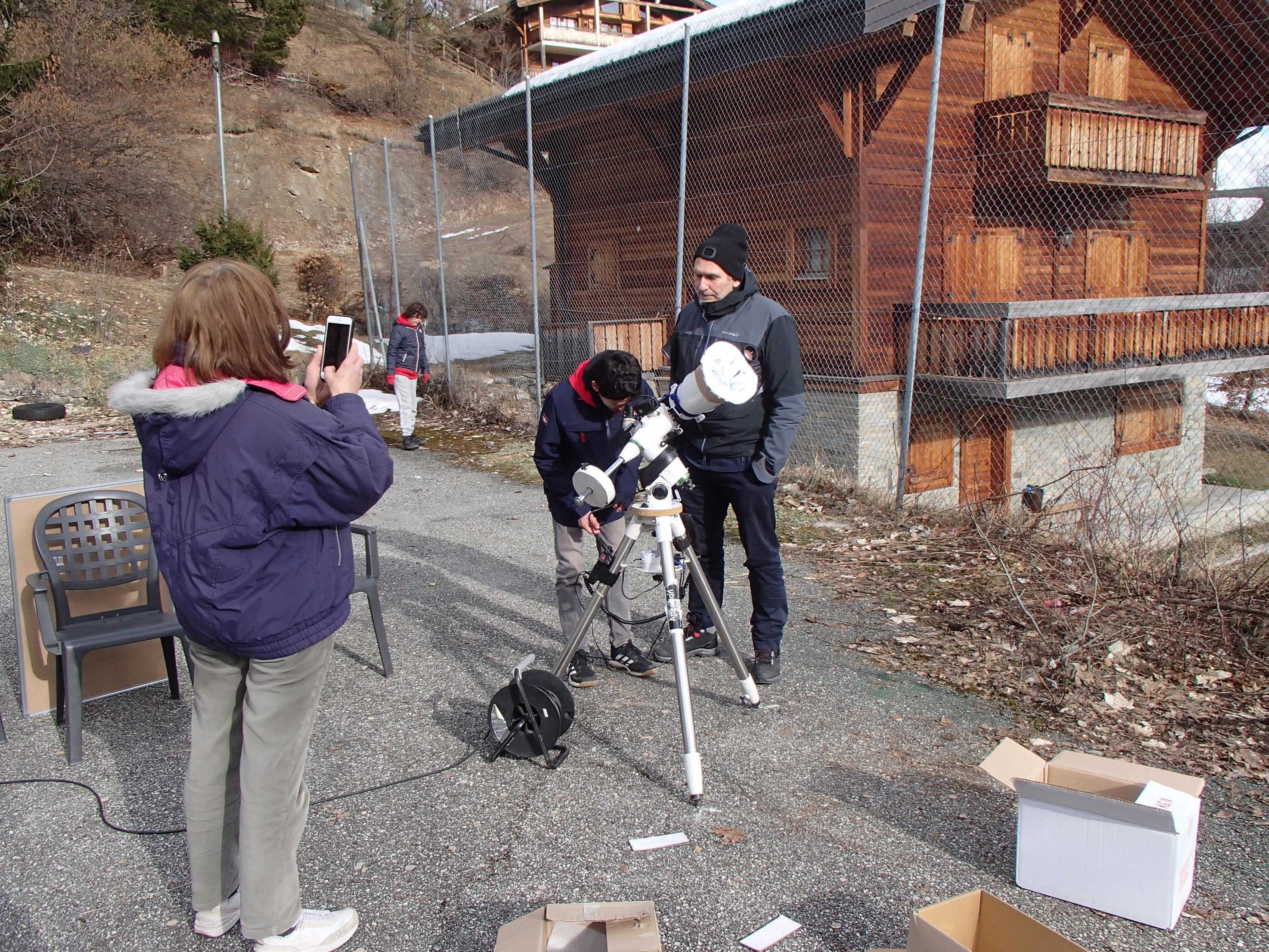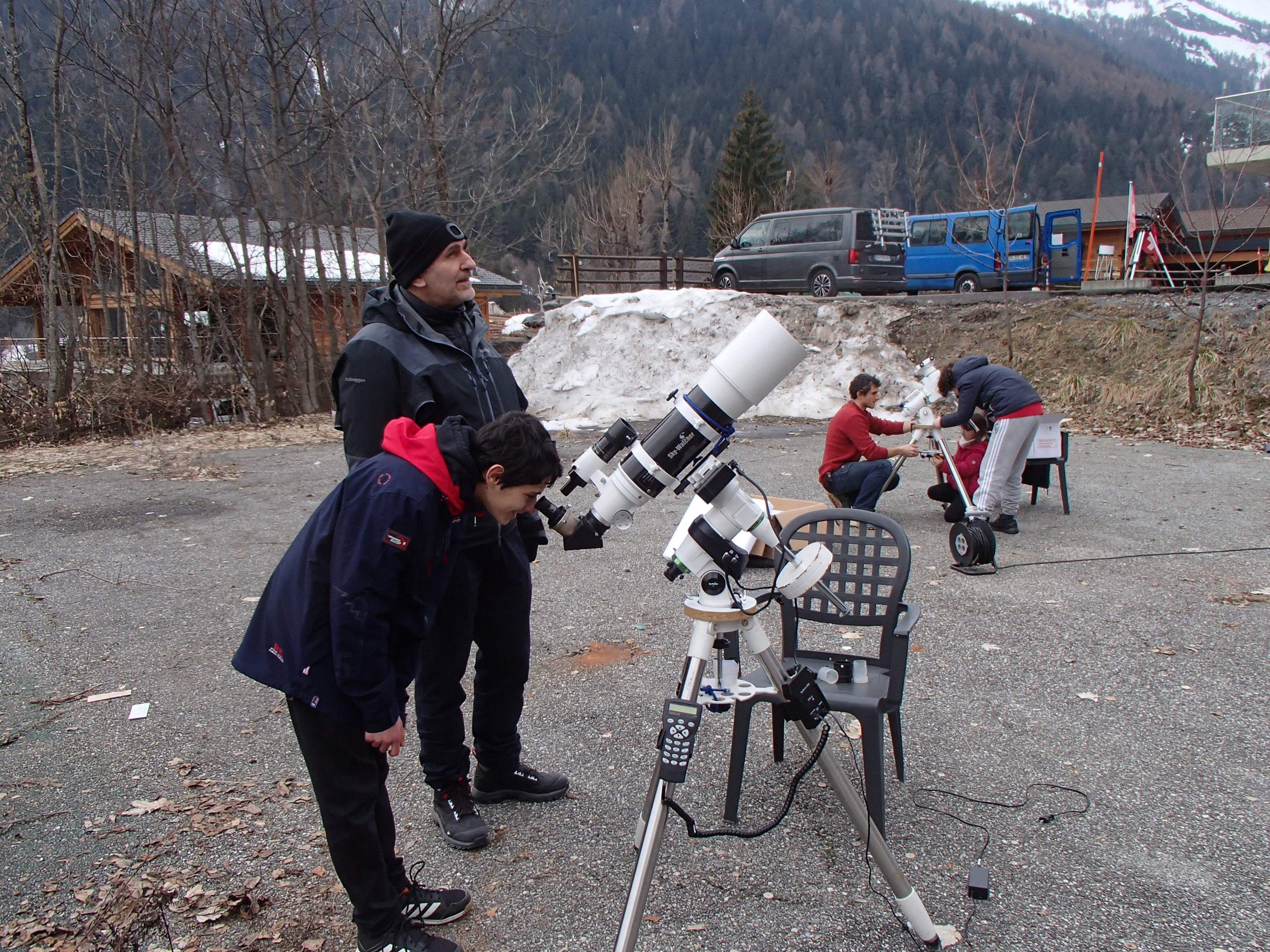 Une première chouette journée ! Nous avons commencé par une matinée pour reprendre en douceur les bases de l’astronomie, histoire de se plonger dans le bain. Beaucoup de questions comme souvent dans ce domaine. L’après midi fut consacrée au matériel et à sa mise en place ainsi qu’à l’analyse de la météo... En effet, une soirée mi figue mi raisin est annoncée... peut être une première occasion d’observation... Et bingo ! Le ciel est même plus dégagé que prévu. Du coup, début de soirée avec le logiciel de planétarium stellarium, suivie d’une mise en pratique, Adam a pu pointer sa nouvelle lunette sur Jupiter et même la grande nébuleuse d’Orion... super chouette ! Nous avons aussi sorti la lunette et le Dobson de 250 mm d’OSI... et même la grosse monture pour prendre des photos de Jupiter et de la Galaxie de Bode (M 81)... nous verrons aujourd’hui ou demain ce que cela donne mais le matériel est en place, et des soirées très correctes sont encore prévues mercredi et jeudi !