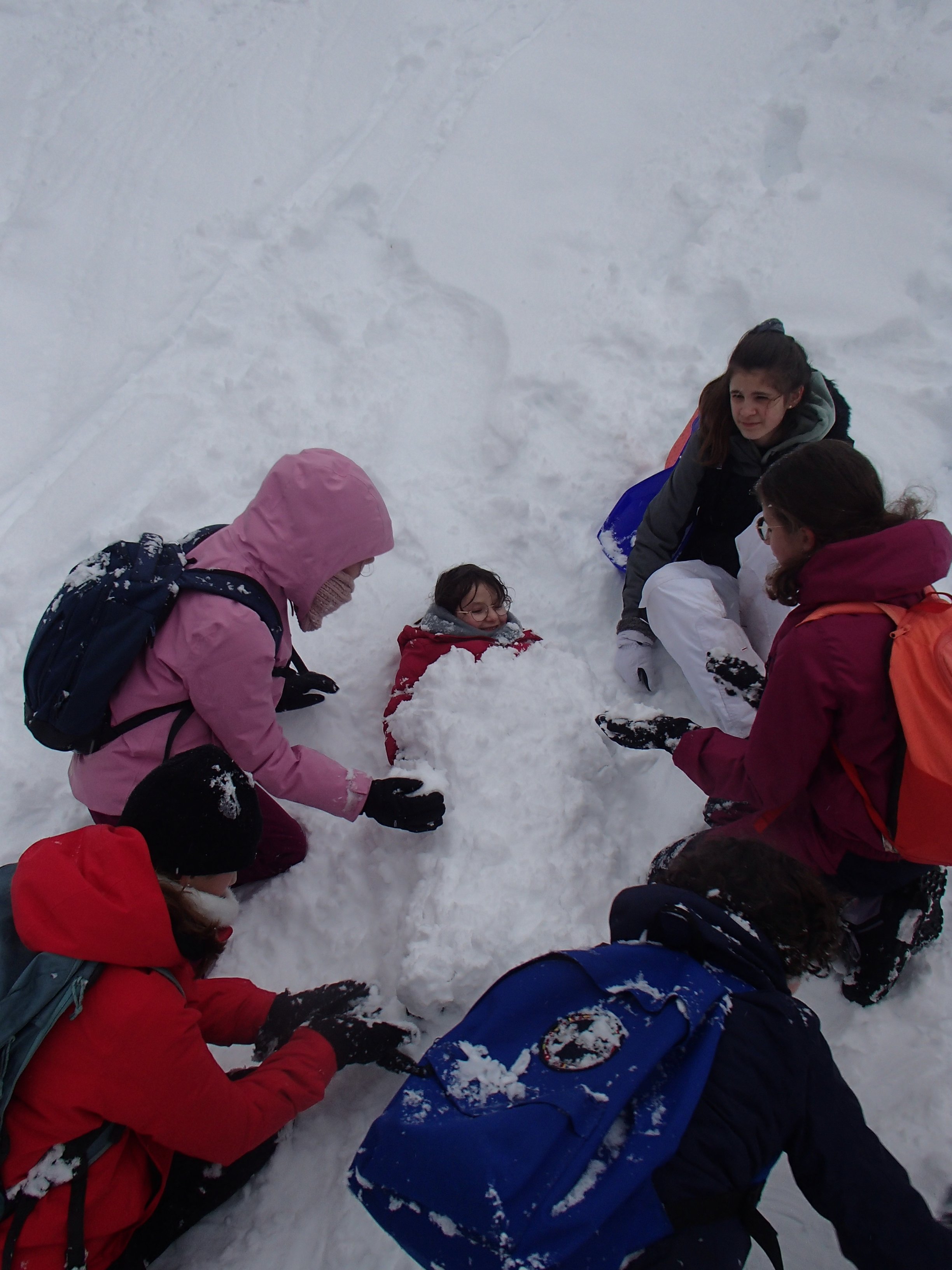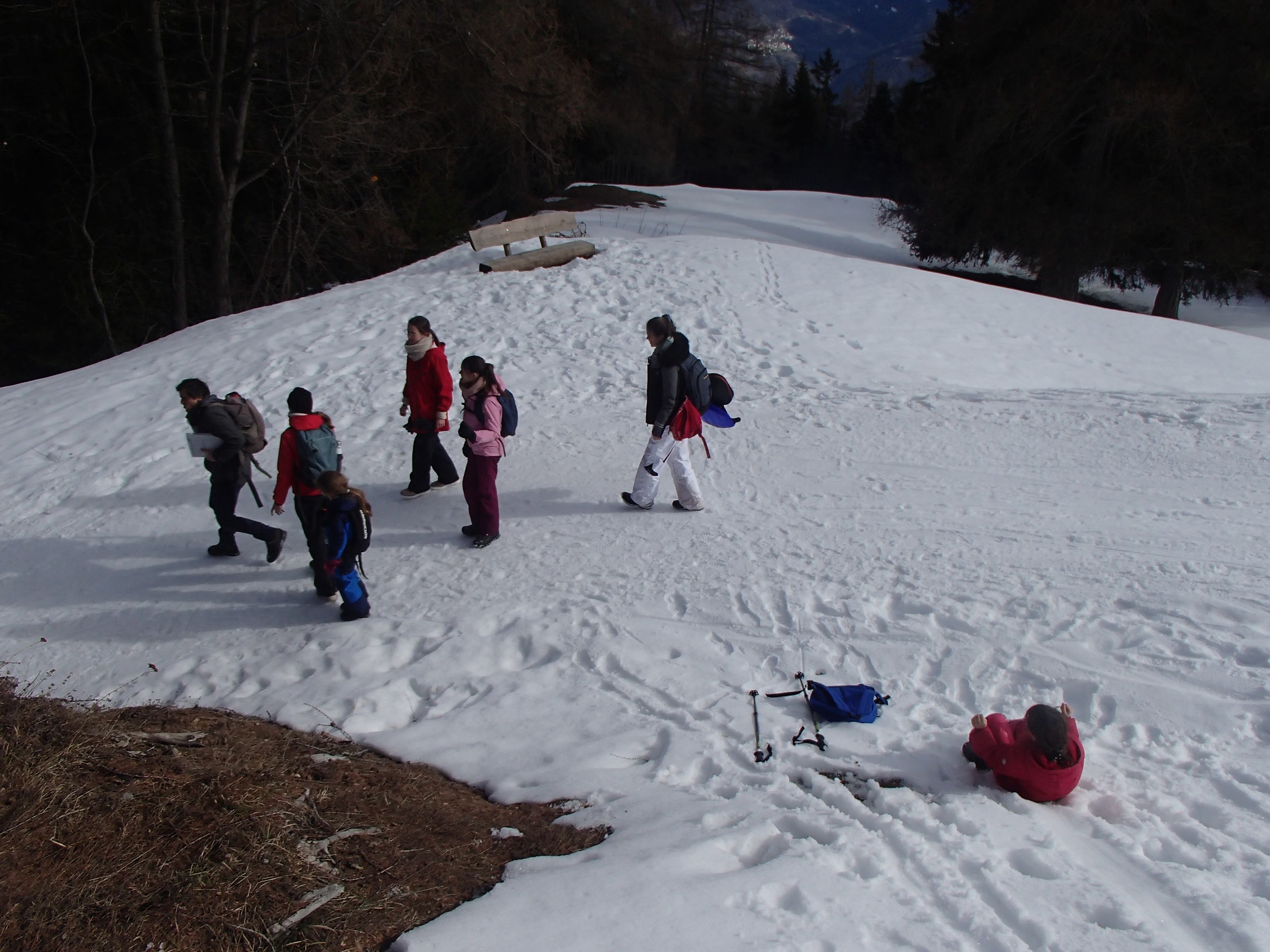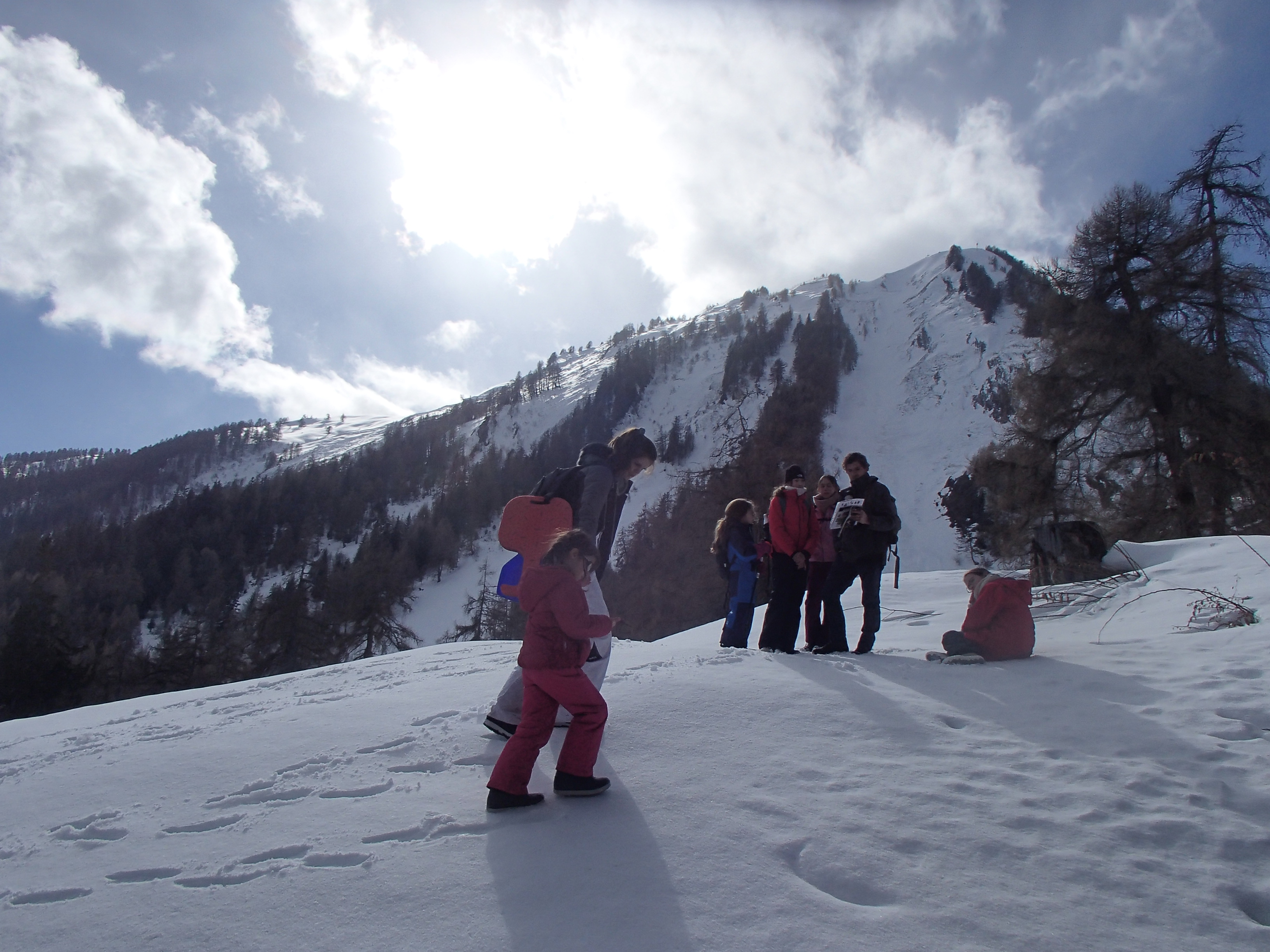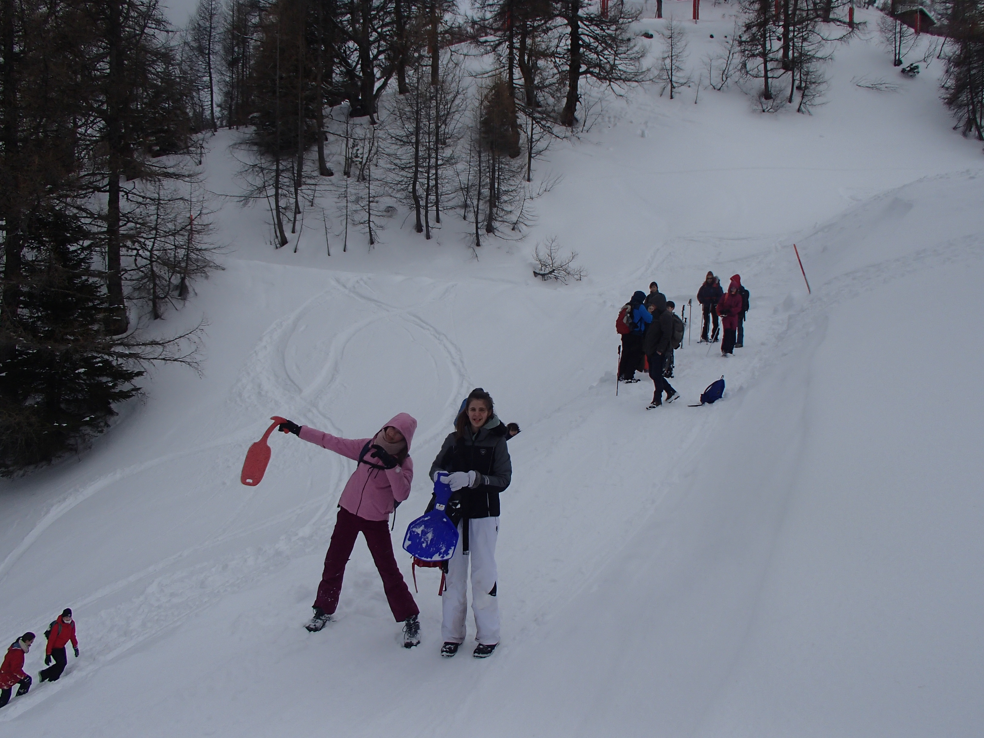 Et nous voici de retour d’une chouette journée de neige tous ensemble, peu de science aujourd’hui. Départ vers 10h ce matin avec le pique-nique, nous montons en télésiège jusqu’à « Jorasse » à quasiment 2000 mètres d’altitude. Depuis là, nous ne faisons que descendre vers Ovronnaz dans la neige, ambiance montagne ! Nous alternons marche, descentes en luge dès que cela s’y prête, bataille de boules... bref on profite de la neige !