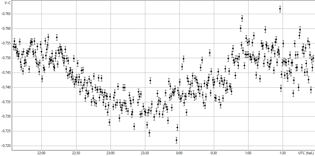La courbe de XO 2N b. On voit nettement le passage de la planète devant son étoile, entre 22h15 et 1h (+ 1h pour l’heure locale). Elle a été partagée sur la plateforme dédiée pour le partage à la communauté scientifique internationale.