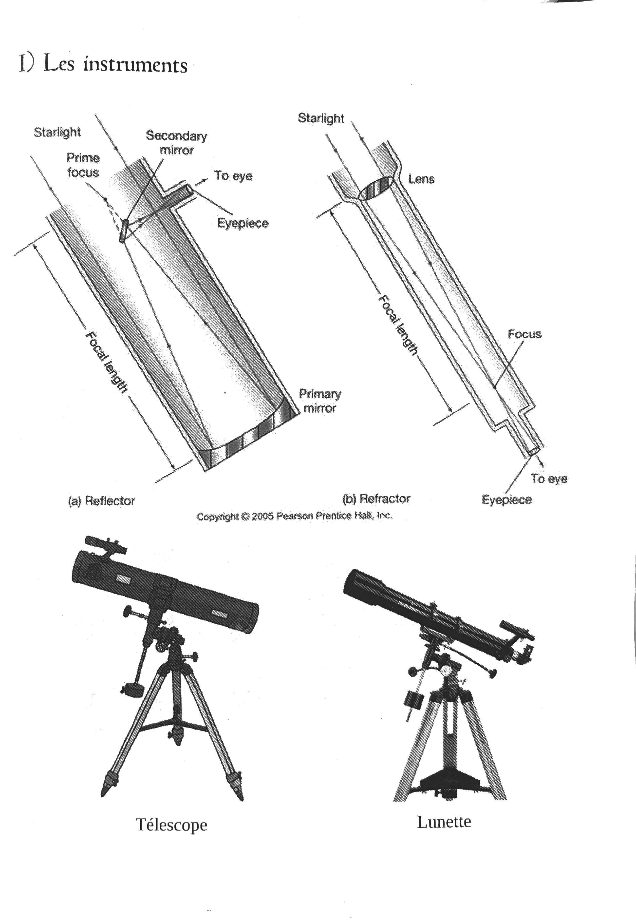 Pour un télescope, la lumière entre, puis est réfléchie sur un miroir qui renvoie la lumière pour qu’on puisse la voir à l’aide d’un oculaire. On peut ensuite régler la netteté grâce à la course (ou molette) de mise au point situé sur l’oculaire. (L’image sur l’un des télescopes avec lequel on a observé était renversée)