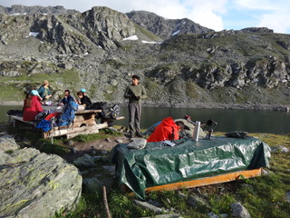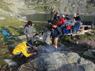 Au programme de cette soirée : baignade dans le lac noir, ascension du schwarzhorn pour les plus courageux, quelques parties de Tarot, création des piques qui serviront à cuire nos mach-mallow et nos cervelas. On a eu la chance de voir la lune se lever à plus de 2700m d’altitude et grâce à une petite lunette que l’on a réussi à emmener, on parvint à observer un très beau Renard, aussi en train de souper, un poisson d’une taille généreuse.