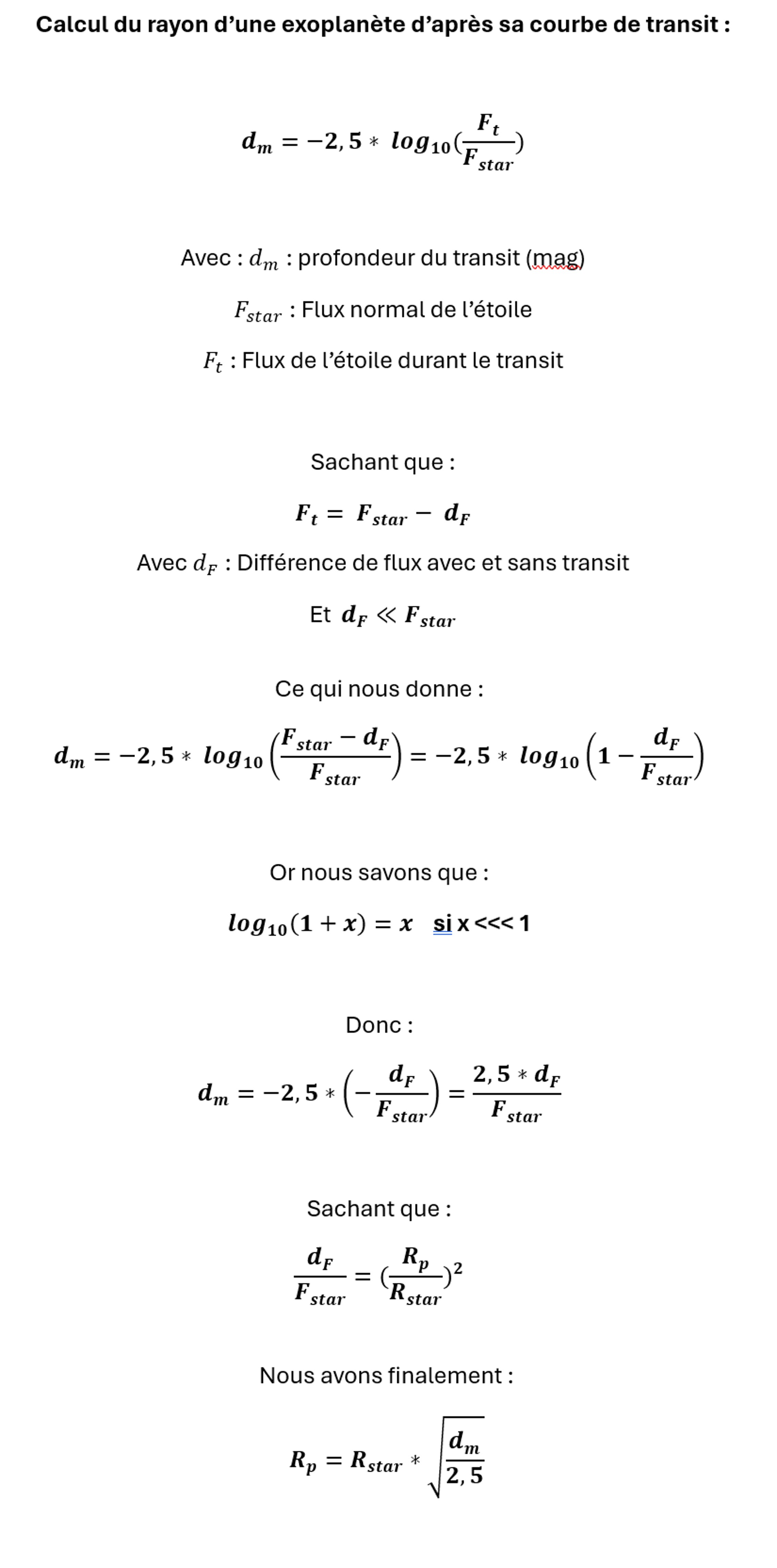 Et bien ce n’est pas si compliqué. Avec quelques calculs de niveau lycée nous pouvons déduire de nos mesures le rayon de l’exoplanète étudiée !
