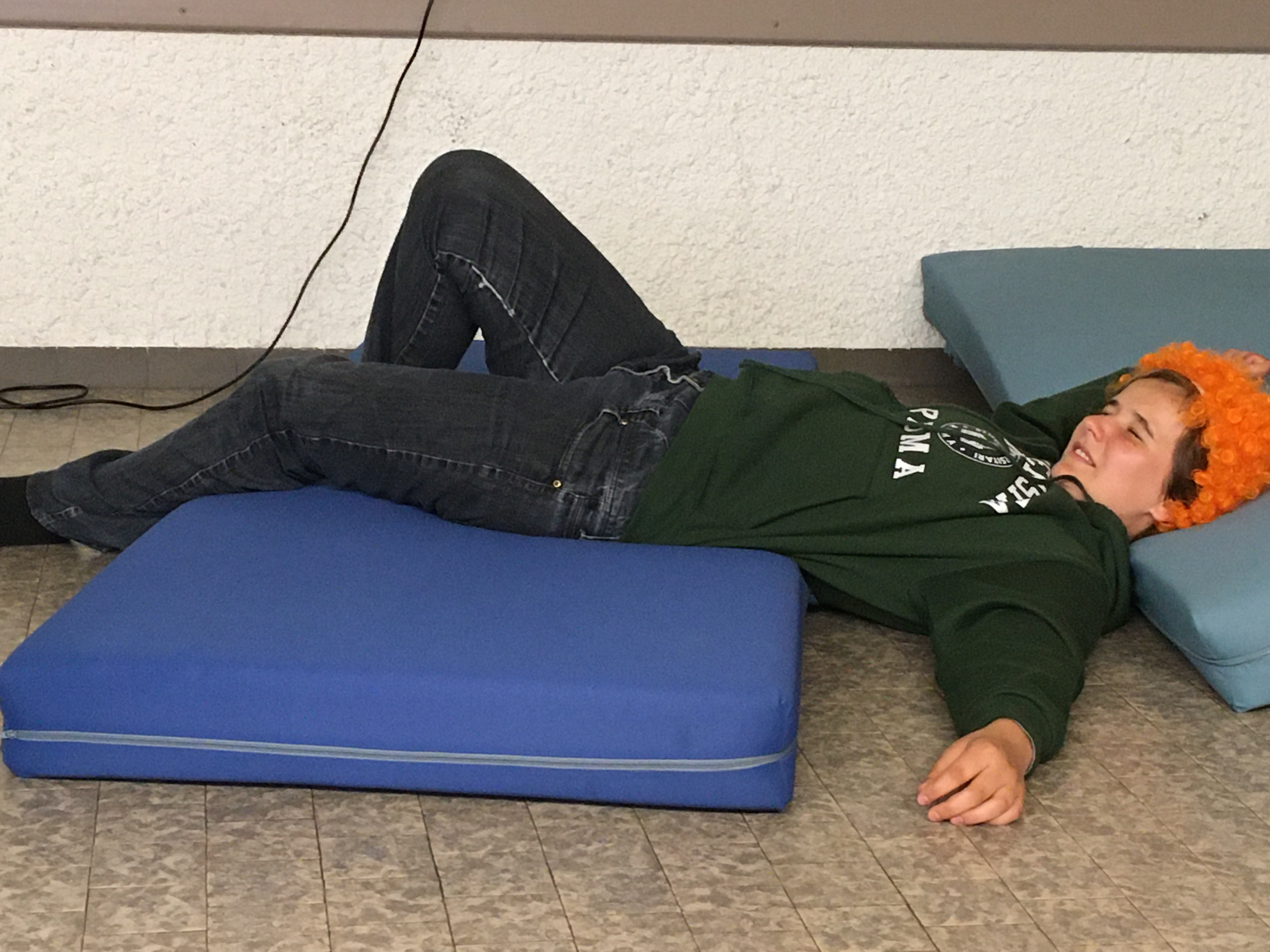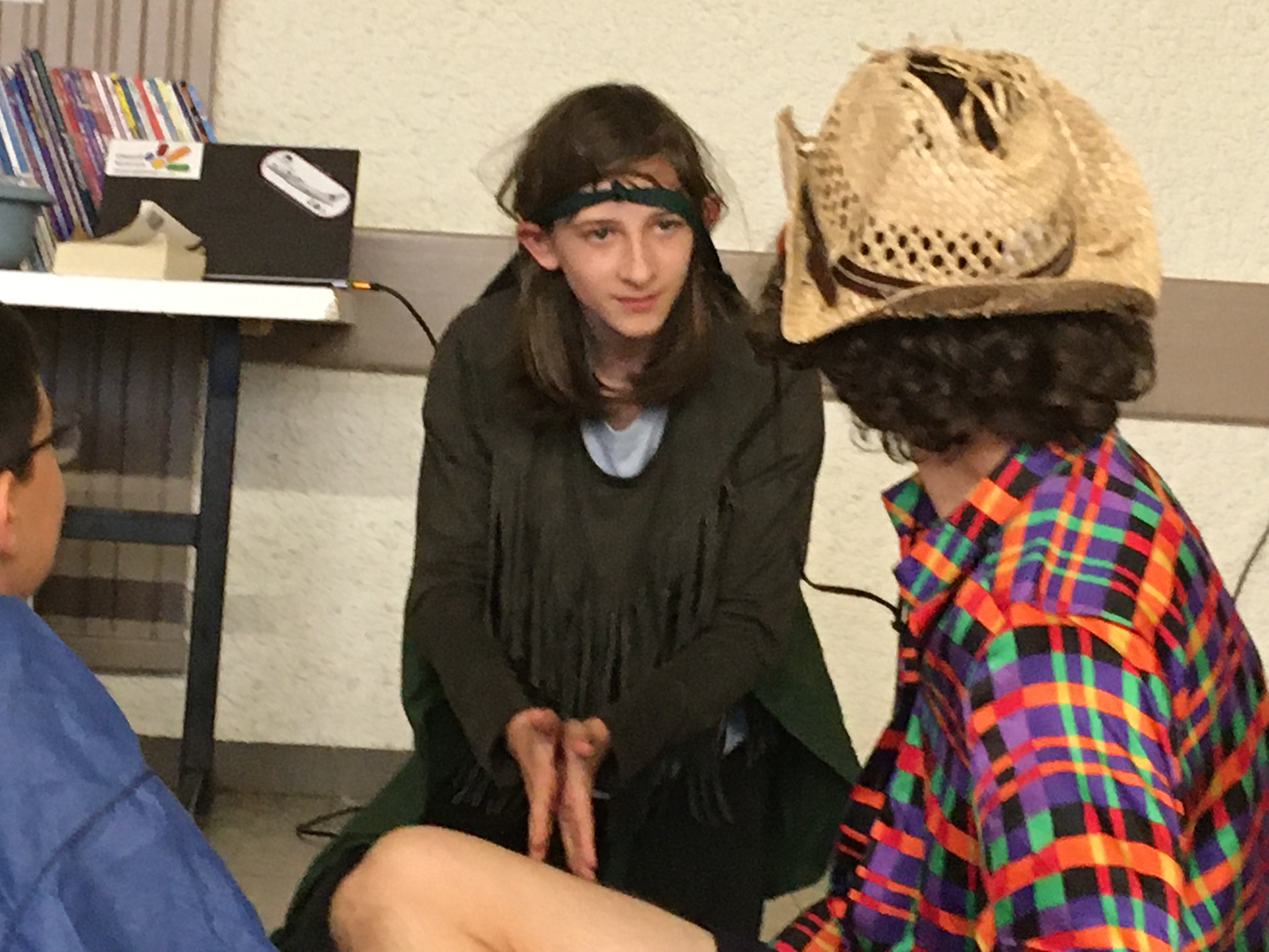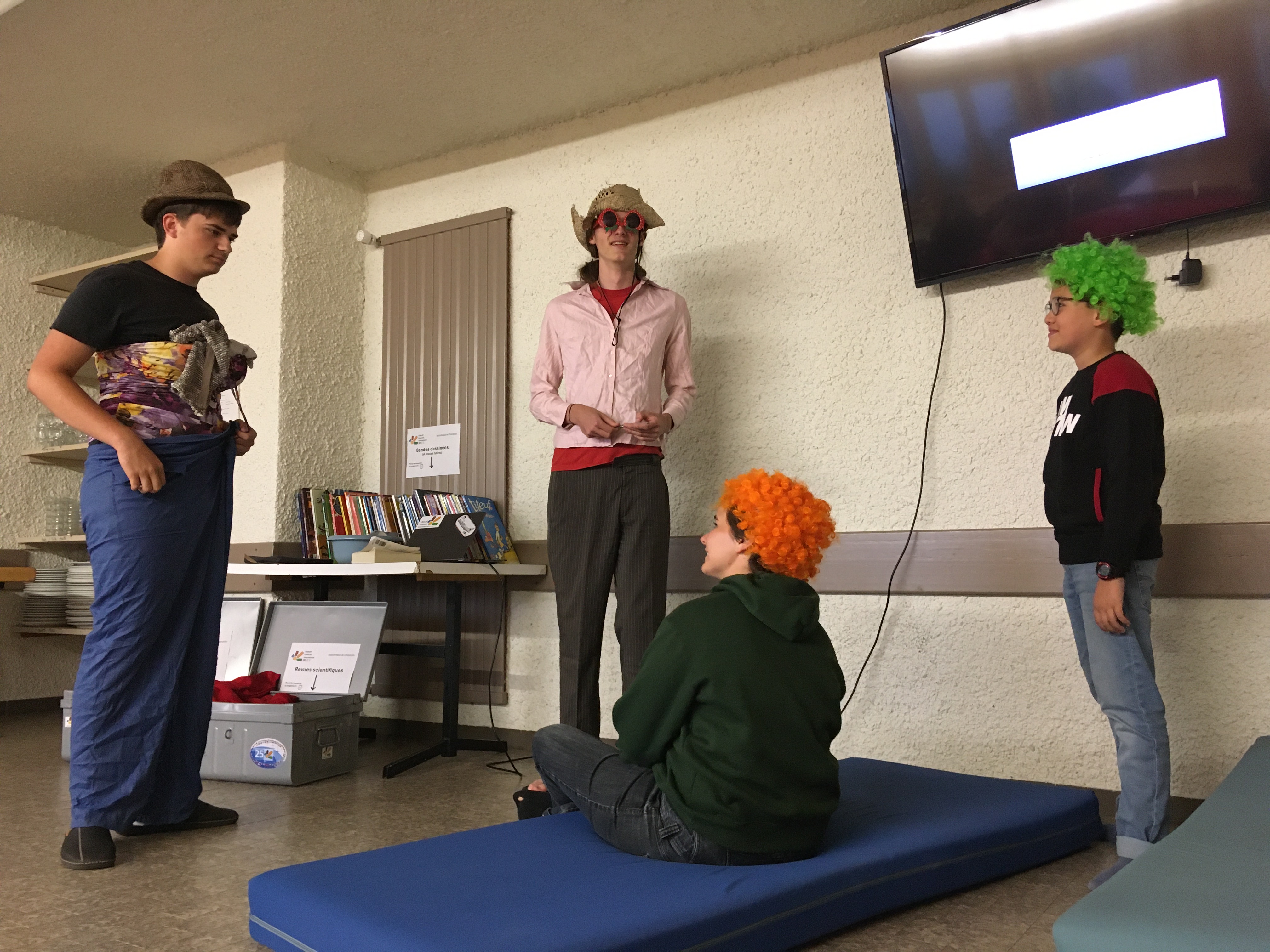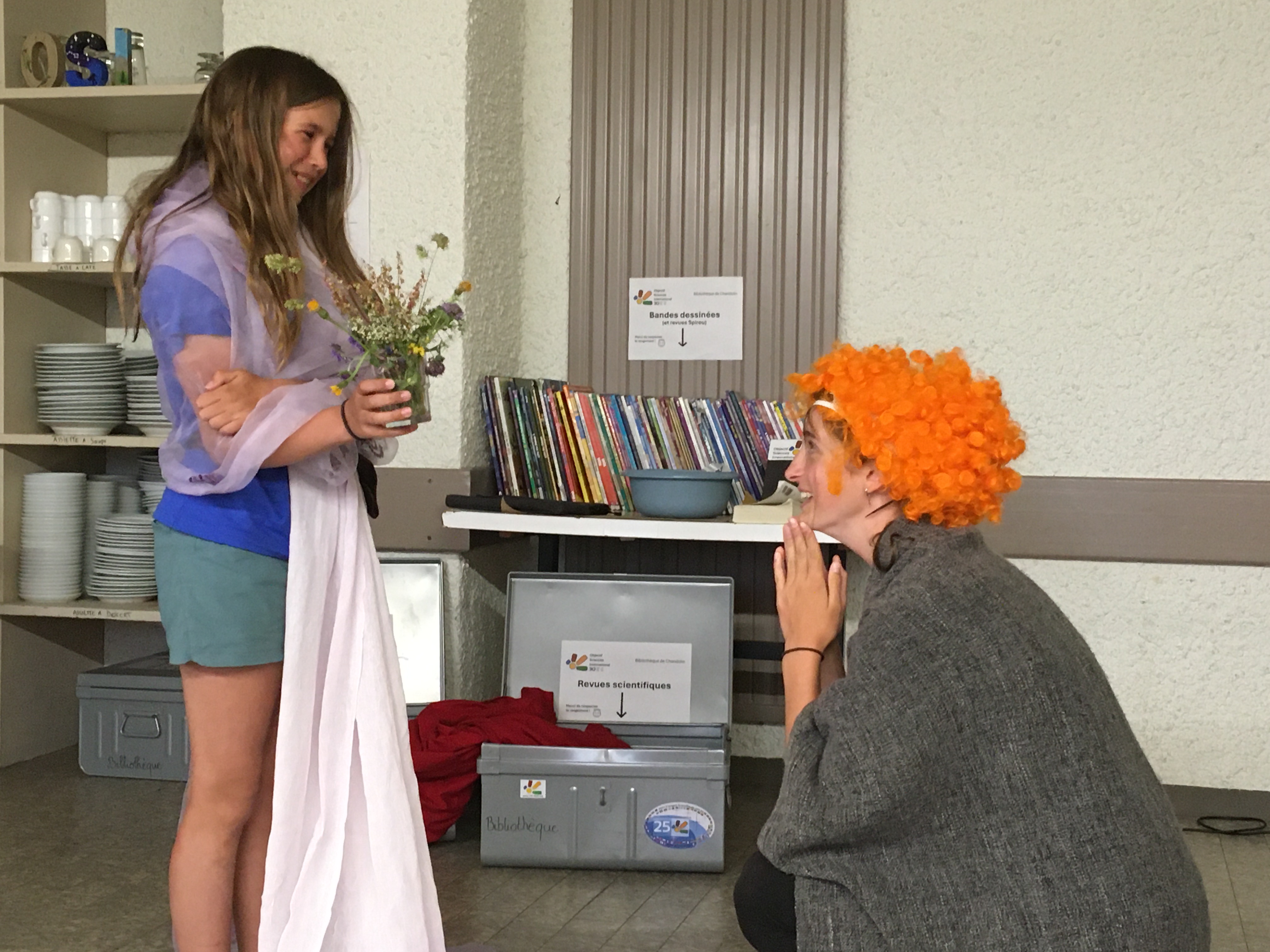 Ensuite, pour la fin de la journée, la grande question : est-ce qu’on va partir au bivouac ou pas ? Le ciel est sombre, il annonce averses et nous sommes hésitants... En plus les éducateurs ont organisé pour nous une super animation, de l’improvisation théâtrale sur l’alphabet, savez-vous de quoi s’agit-il ? La voilà !