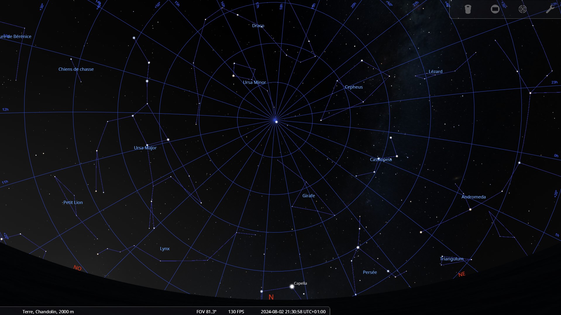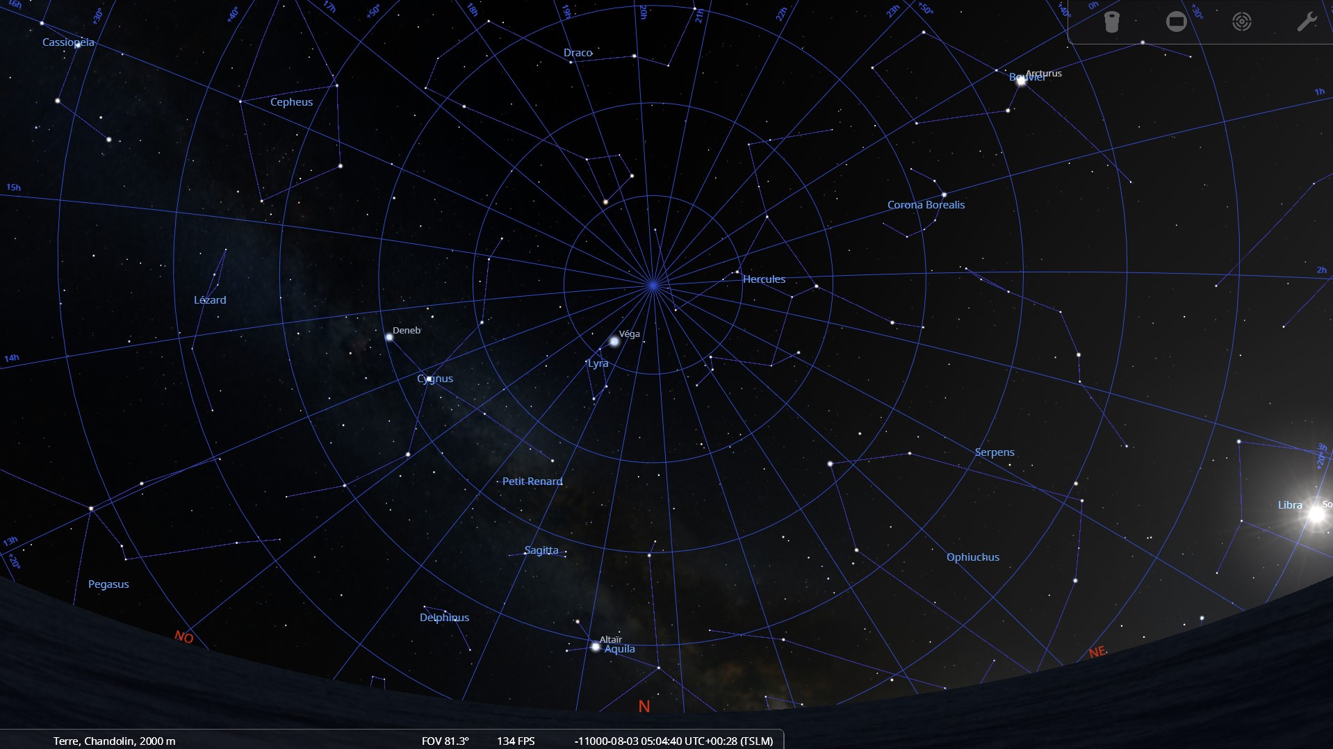 Un dernier tour sur Stellarium pour comprendre le mouvement des étoiles dans le ciel sur un temps très long, ainsi que les oscillations de l’axe de rotation de la terre entre Véga et l’étoile Polaire (qui ne l’est pas toujours vous l’aurez compris). Cette oscillation prend 26000 ans et est appelé la « précession des équinoxes ».