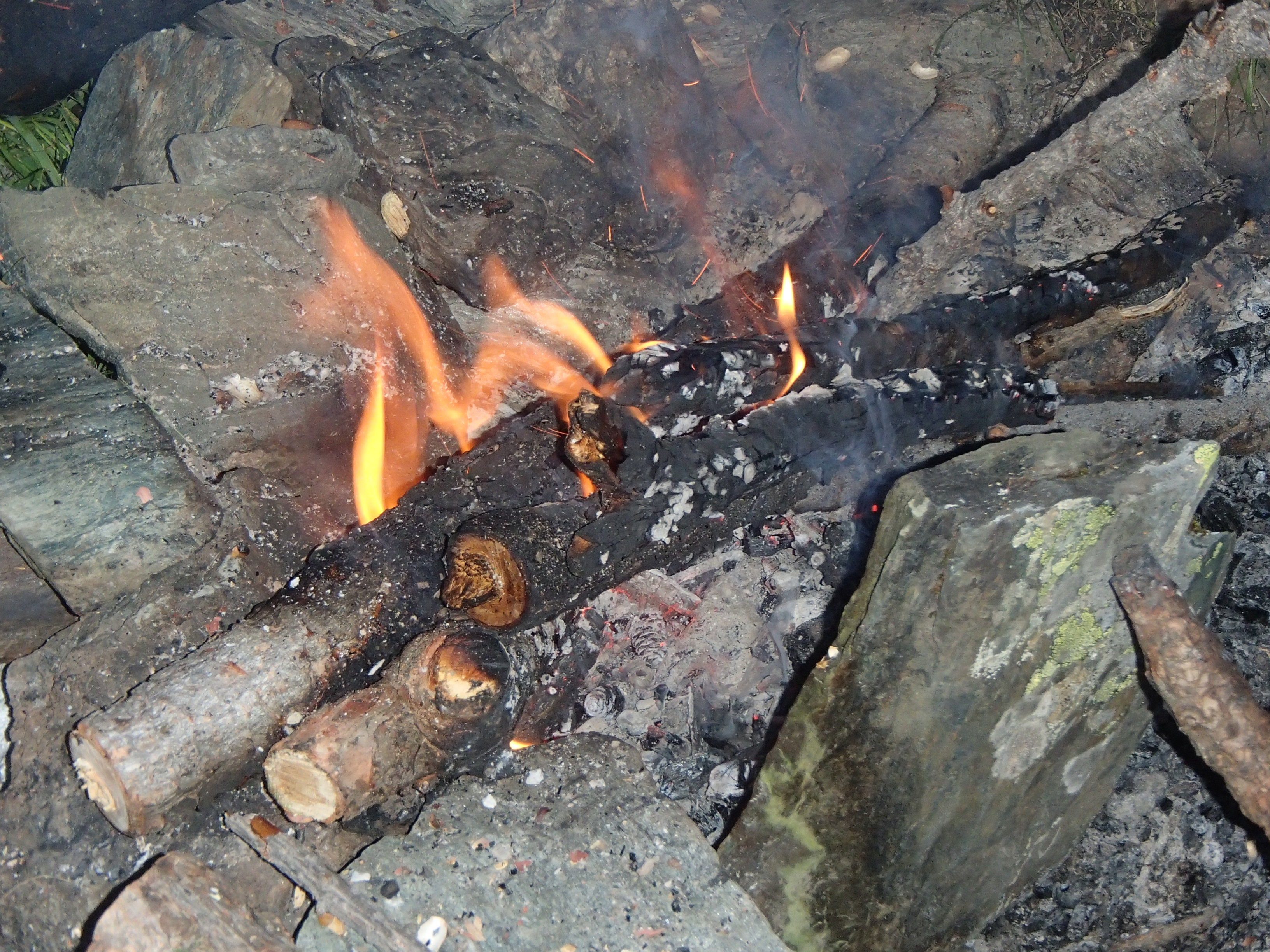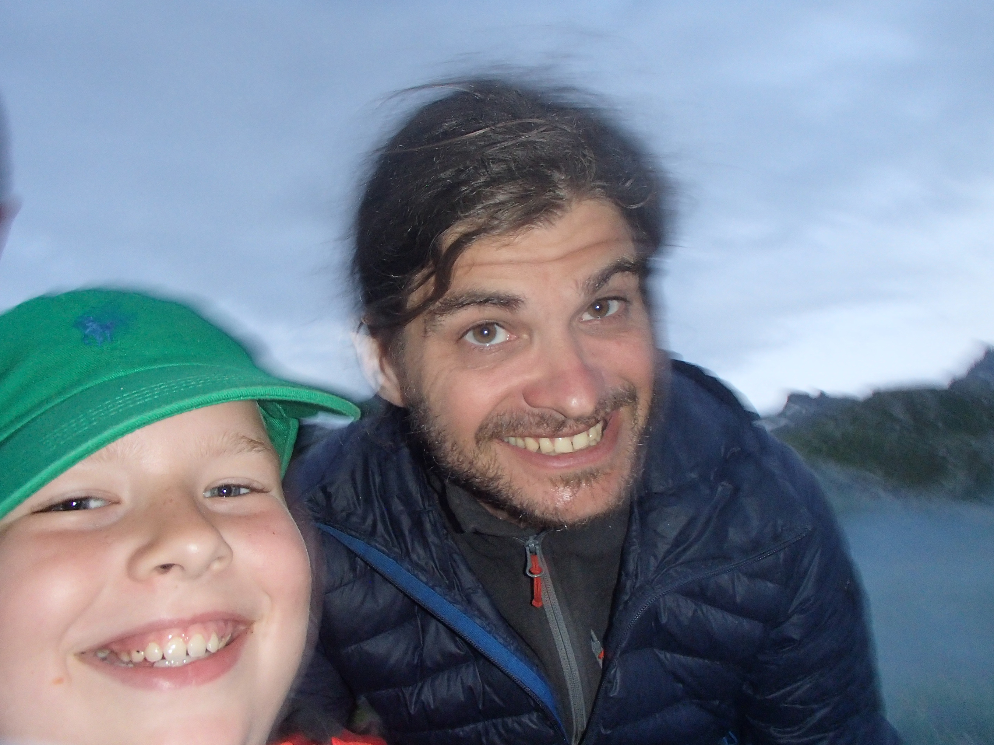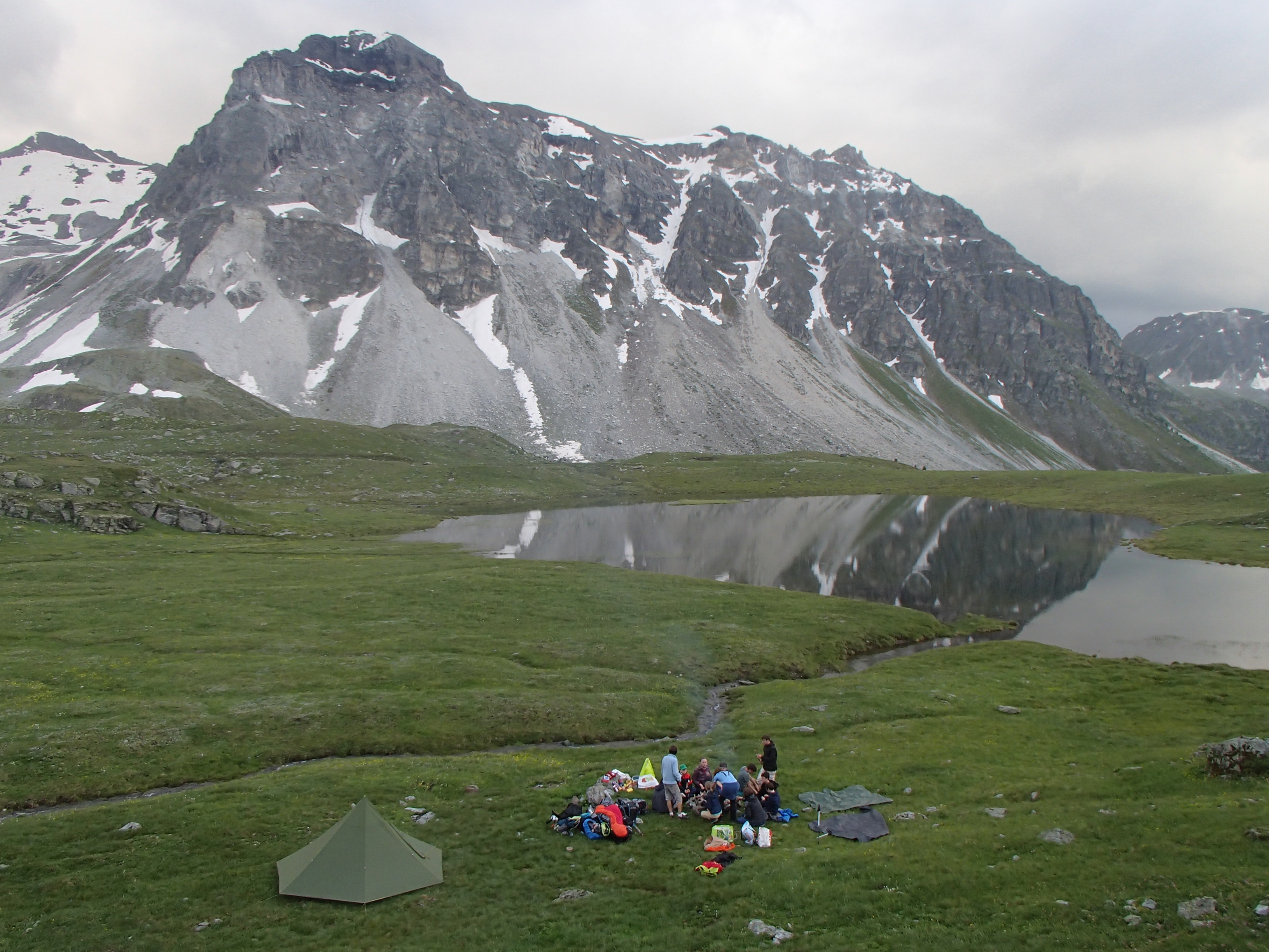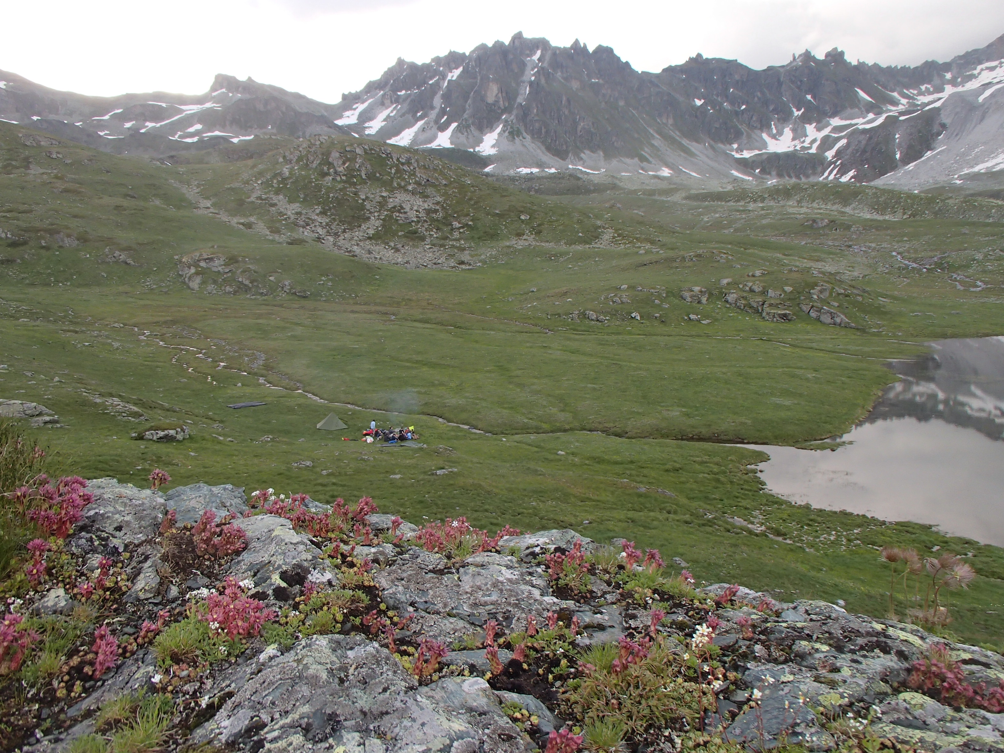 Pendant ce temps... la montée au lac de Larmina se passe sans encombre en tirant juste un peu la langue dans la partie un peu raide du chemin... mais à peine arrivés, surprise ! Un petit grain de grêle s’invite à la fête. Heureusement, les affaires sont déjà à l’abri et une tente déjà montée pour se garder à peu près au sec. Après le retour de Fabien parmi nous, la soirée se déroule pour le mieux autour du feu de camps, à faire griller des saucisses. Juste quelques gouttes de pluie de temps à autre comme annoncé par la météo locale... qui à ce moment nous annonce encore un risque de pluie nul à partir de 23h et une nuit sèche.... mhouais... Coucher vers 23h00 alors que les dernières gouttes de pluie prévues viennent de passer. Malheureusement, 1h plus tard, un grain pluvieux nous retombe dessus, alors que même le radar de pluie ne l’annonce pas... Résultat, en 45 minutes nous sommes bien trempés. Heureusement qui dit temps couvert dit températures clémentes. Du coup même mouillés sur des bâches transformées en piscine par endroit, les jeunes n’ont pas froid, et nous pouvons donc finir cette nuit agitée par quelques heures de sommeil sans avoir besoin d’envisager de replier le camp de manière précipitée.