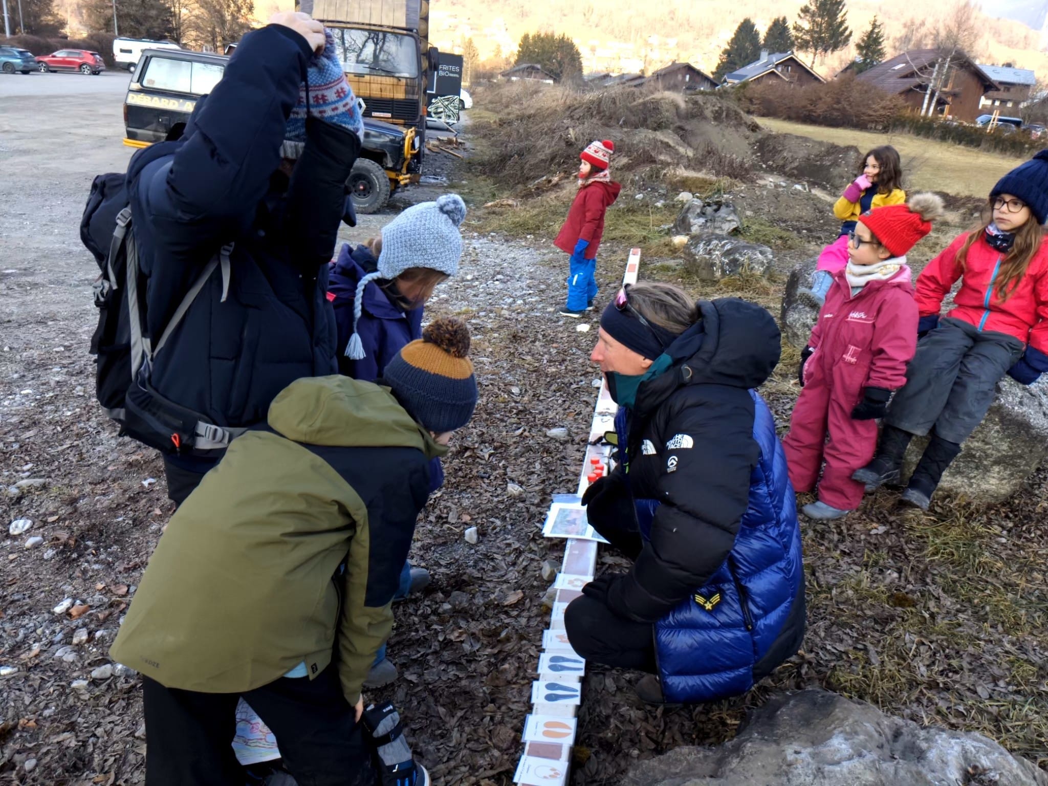 Ce matin, trois ateliers. Le premier : assis·e·s confortablement sur des tapis, nous avons découvert et identifié des crânes, cornes, bois, os, pattes et crottes d’animaux de montagne. Nous étions ainsi prêt·e·s pour les recherches de traces de l’après-midi.
