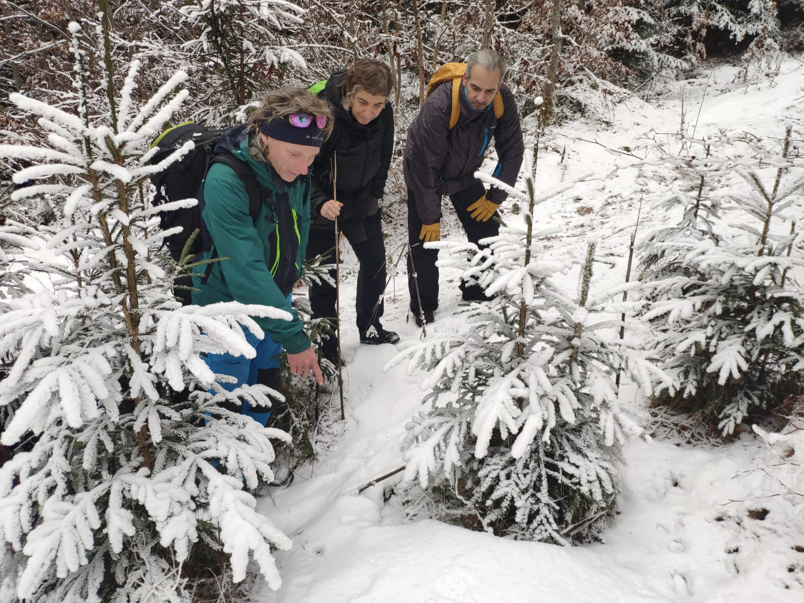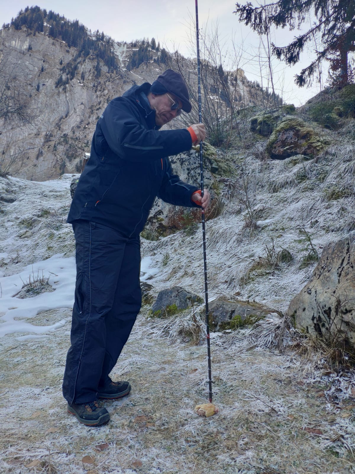 Puis, au cas où (malgré le peu de neige), nous avons travaillé sur la prévention des avalanches et le secours aux victimes. Surprise : le chien du gîte a trouvé le premier DVA de l’exercice pratique de recherche ! Mais, bien heureusement, survivante de cette matinée, Amélie a su sauver les trois autres.