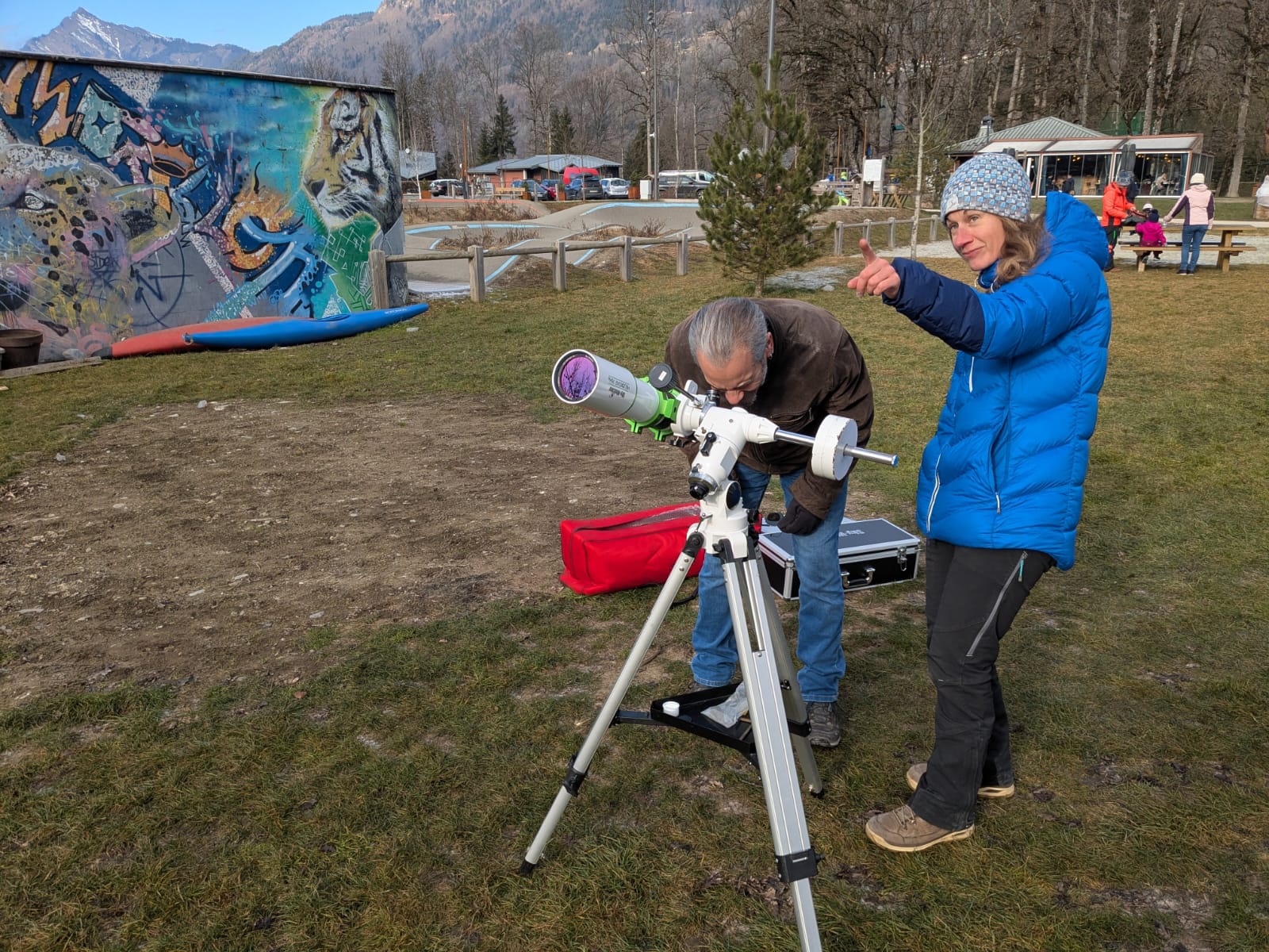 Et pour terminer cette semaine astronomique, nous voilà partis pour admirer le soleil au Lac de Morillon. Malgré l’efficacité de l’équipe qui sait maintenant monter un télescope, un vilain nuage avait décidé de rendre l’observation plus que compliquée !